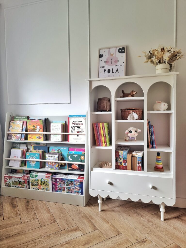 Pokój Montessori powinien być przestronny, uporządkowany i dostosowany do wieku dziecka. Kluczowe jest zapewnienie łatwego dostępu do przedmiotów, które umożliwią dziecku samodzielne korzystanie z zabawek i materiałów edukacyjnych. Regał Book Nook na poziomie wzroku dziecka, niskie biurko Montessori Book Nook z krzesełkiem oraz otwarte koszyki do przechowywania to elementy, które pomagają w nauce organizacji i rozwijają zdolność podejmowania decyzji.