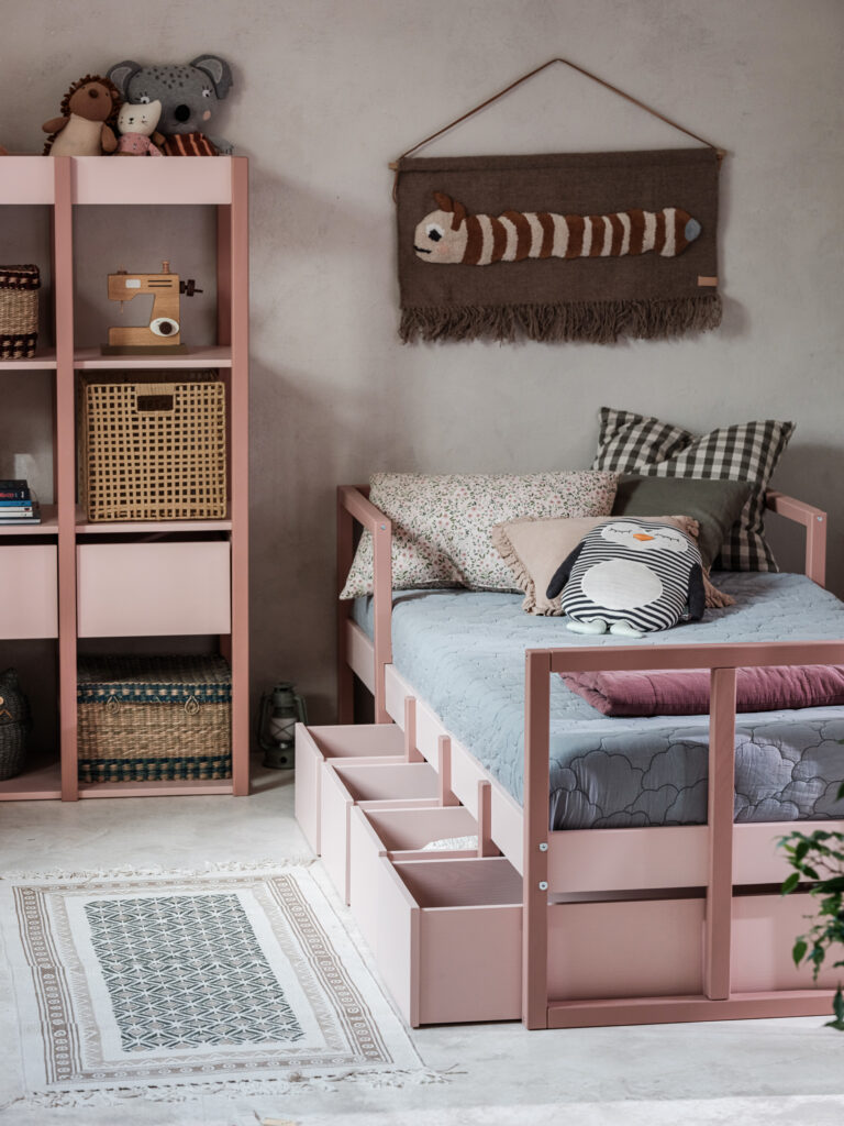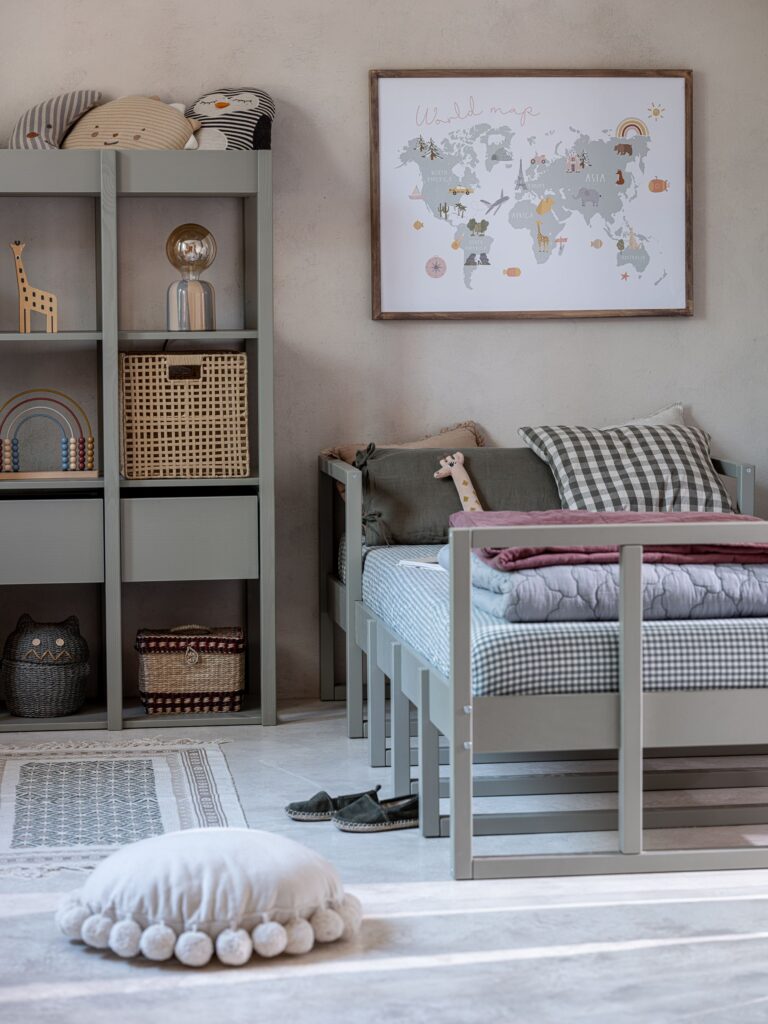 - Łóżka piętrowe lub z antresolą – dzięki nim znajdzie się miejsce nie tylko do spania, ale i nauki czy zabawy. Antresola daje dodatkową przestrzeń pod łóżkiem, np. na biurko lub szafkę – świetna opcja, gdy w pokoju mieszka młodsze dziecko i starsze.