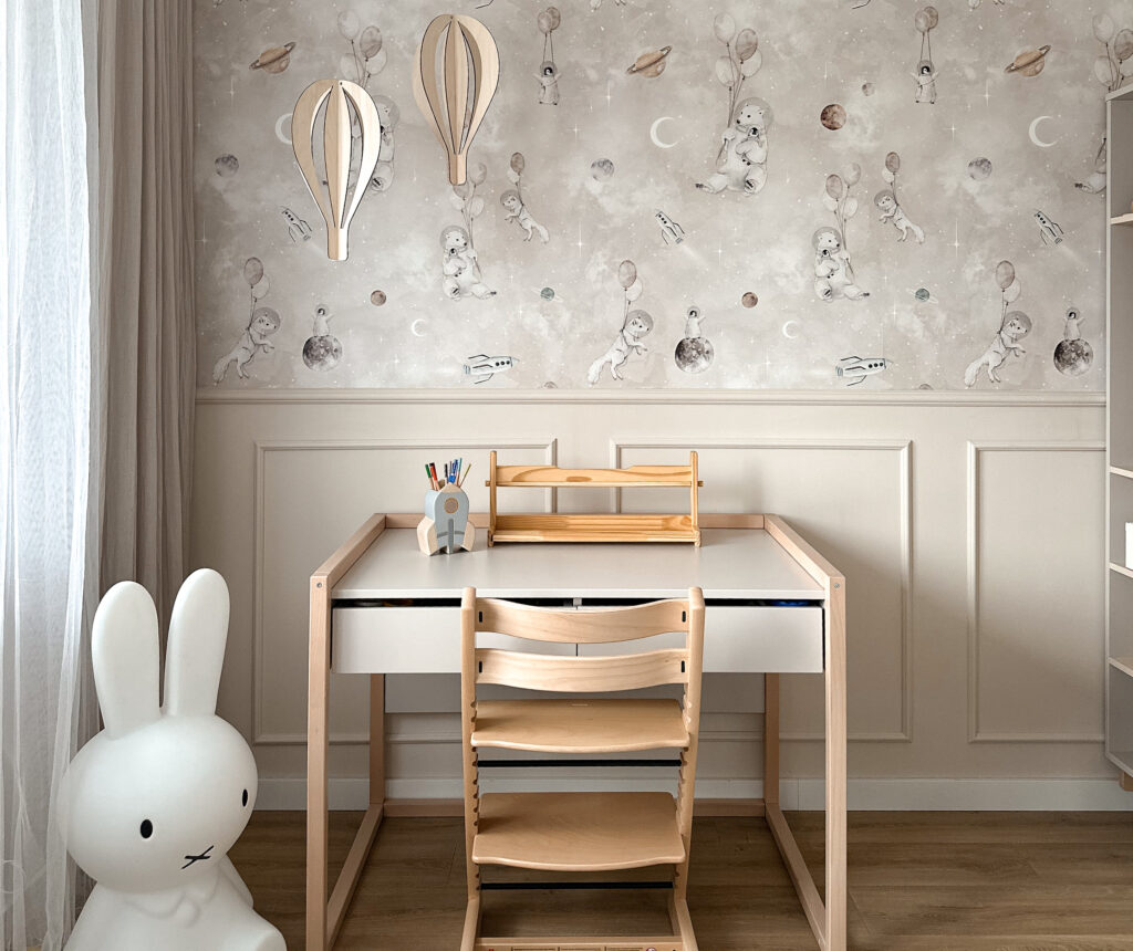 - Tapety tylko na jednej ścianie – z motywami leśnymi, gwiezdnymi lub edukacyjnymi.