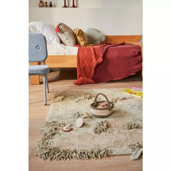 Prostokątny dywanik do zabawy inspirowany jesiennym lasem pełnym mchu i paproci, gdzie grzyby wyglądają spod opadłych liści. Delikatne, ręcznie wykonane detale z płótna i szenilu w jesiennych kolorach, takich jak oliwkowa zieleń, miód i złote odcienie brązu, nadają temu dywanikowi oryginalną fakturę. W zestawie z uroczym bawełnianym koszyczkiem i 9 ręcznie robionymi kurkami do zabawy.