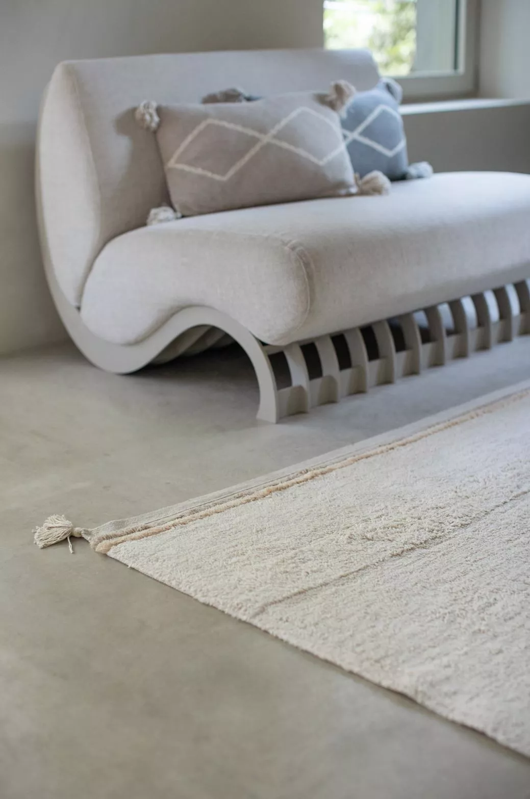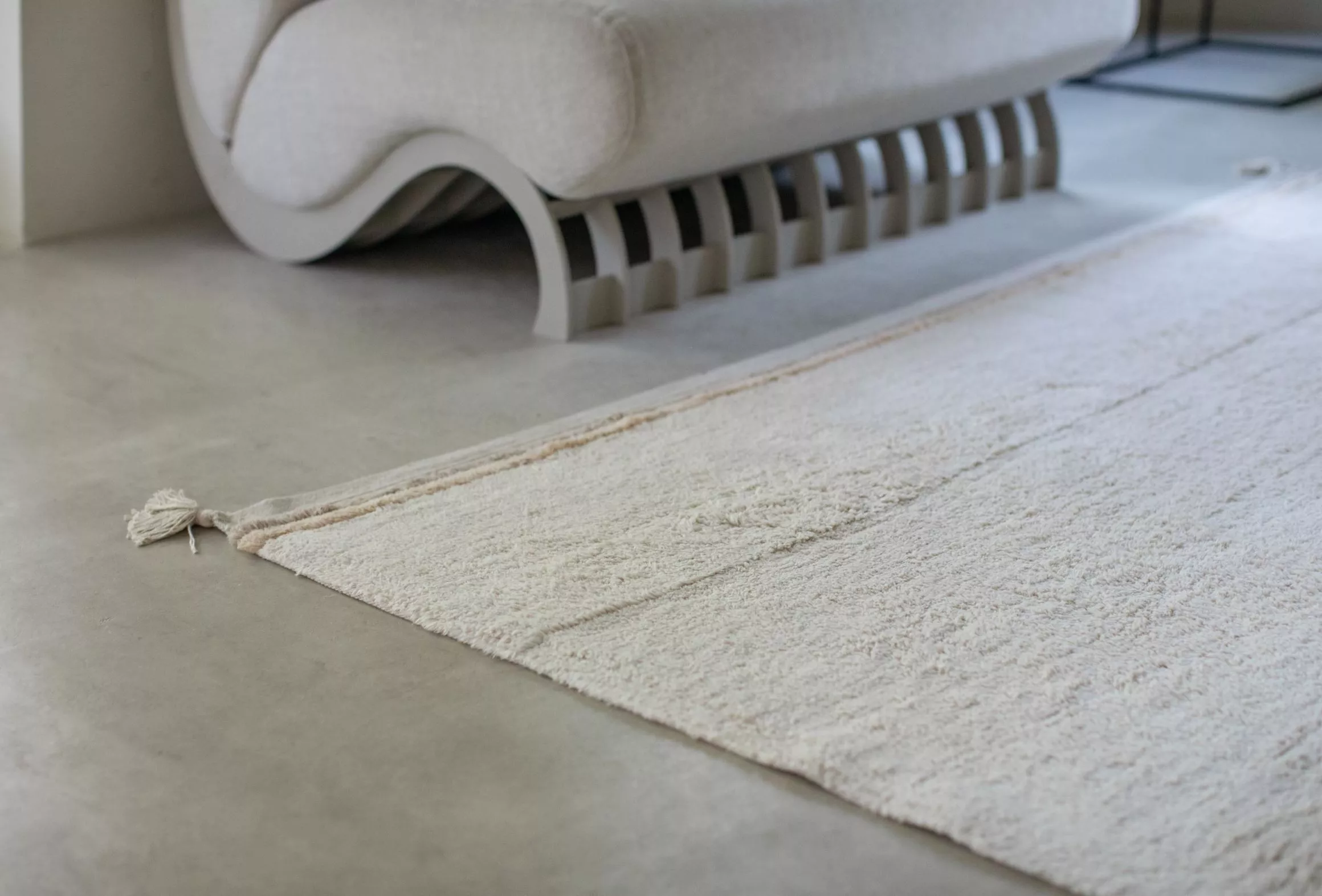 Elegancki, jednokolorowy dywan do pokoju z miękkim, krótkim włosiem i frędzlami, nadający wnętrzu charakteru. Ten projekt jest rozszerzeniem kolekcji RugCycled®, dzięki której nasza produkcja jest ekologiczna, w duchu zero waste.