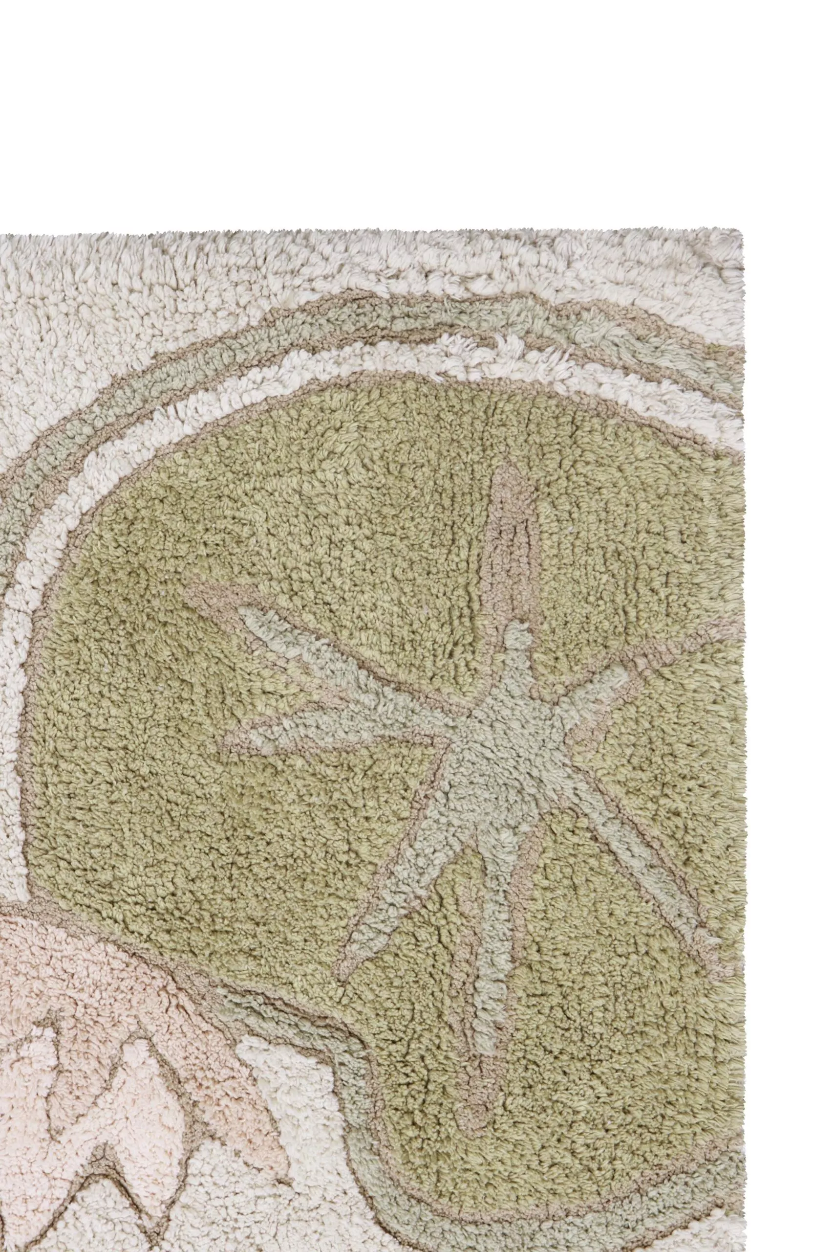 Niektóre rośliny wystają na brzegach jako ręcznie robione warkocze lub frędzle. Pastelowa paleta kolorów łączy odcienie różu, fioletu, jasnożółtego i zielonego z naturalną bawełnianą bazą. Do zestawu dołączona jest wypchana bawełniana żaba w kolorze oliwkowym. Płócienna podstawa dywanu wykonana jest z pochodzącej z recyklingu bawełny z domieszką przędzy RugCycled®.