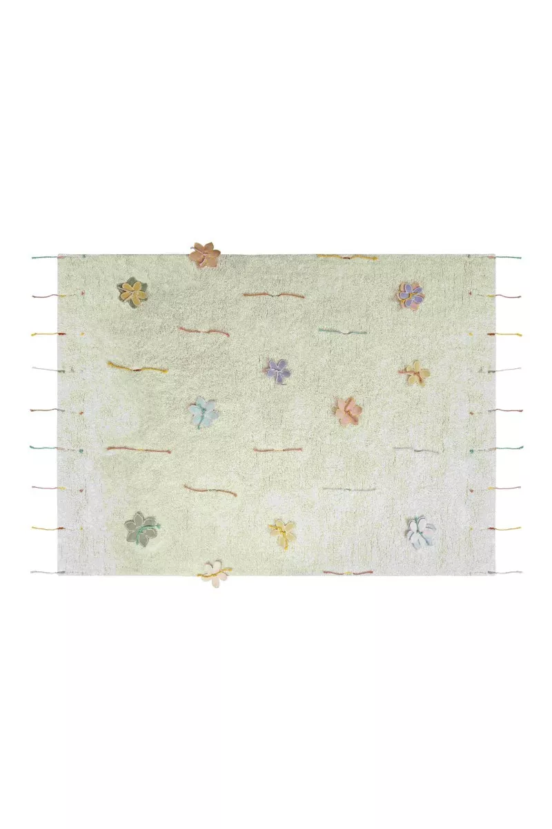 W zestawie znajduje się 14 kwiatów z bawełnianego płótna, które można łatwo zawiązać na dywanie za pomocą kolorowych sznurków.