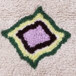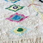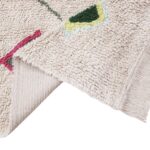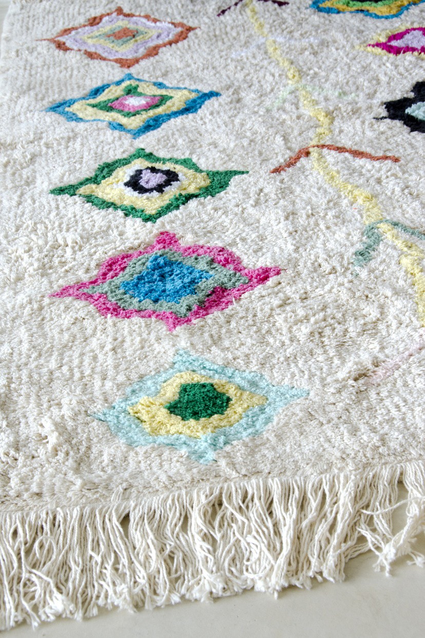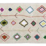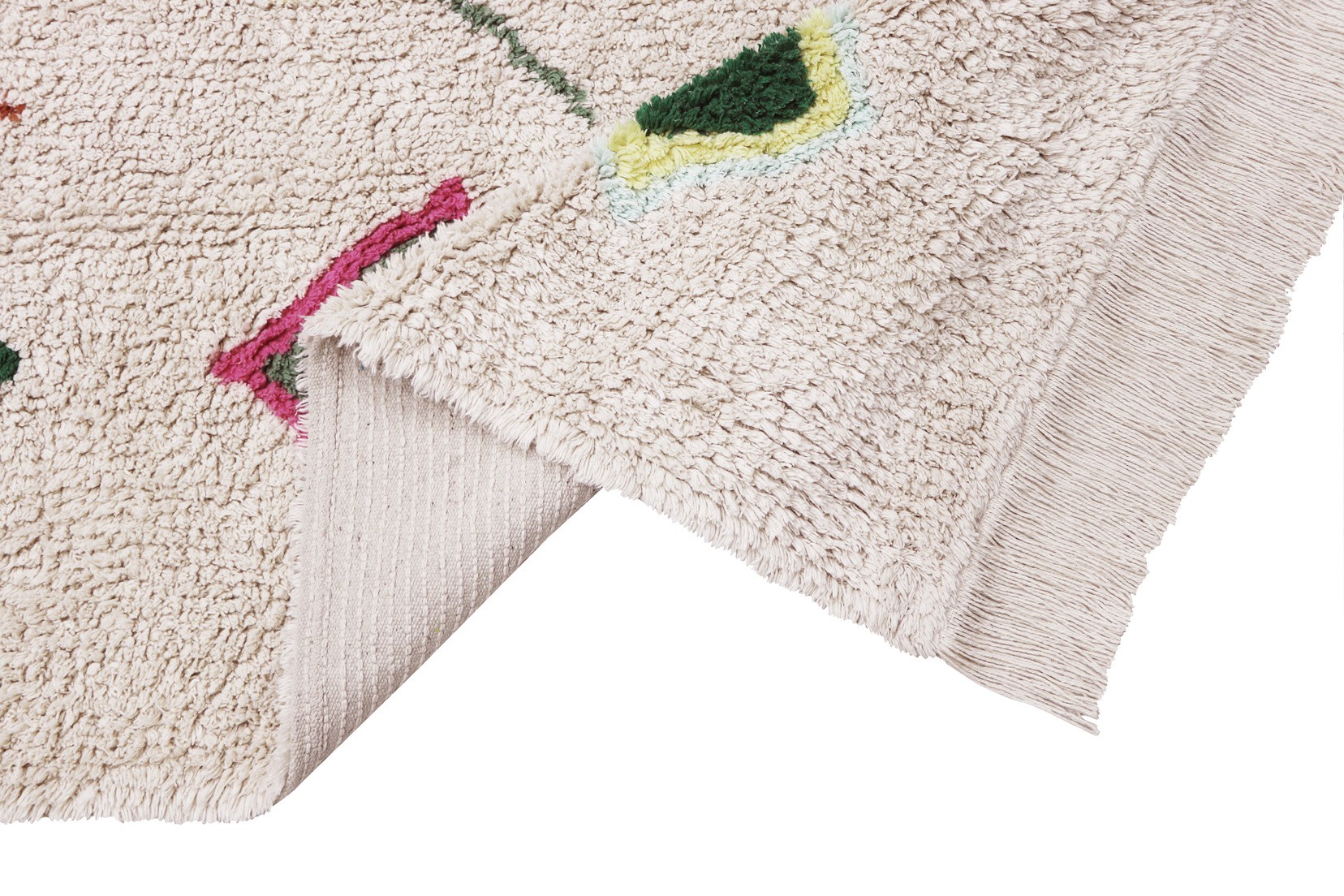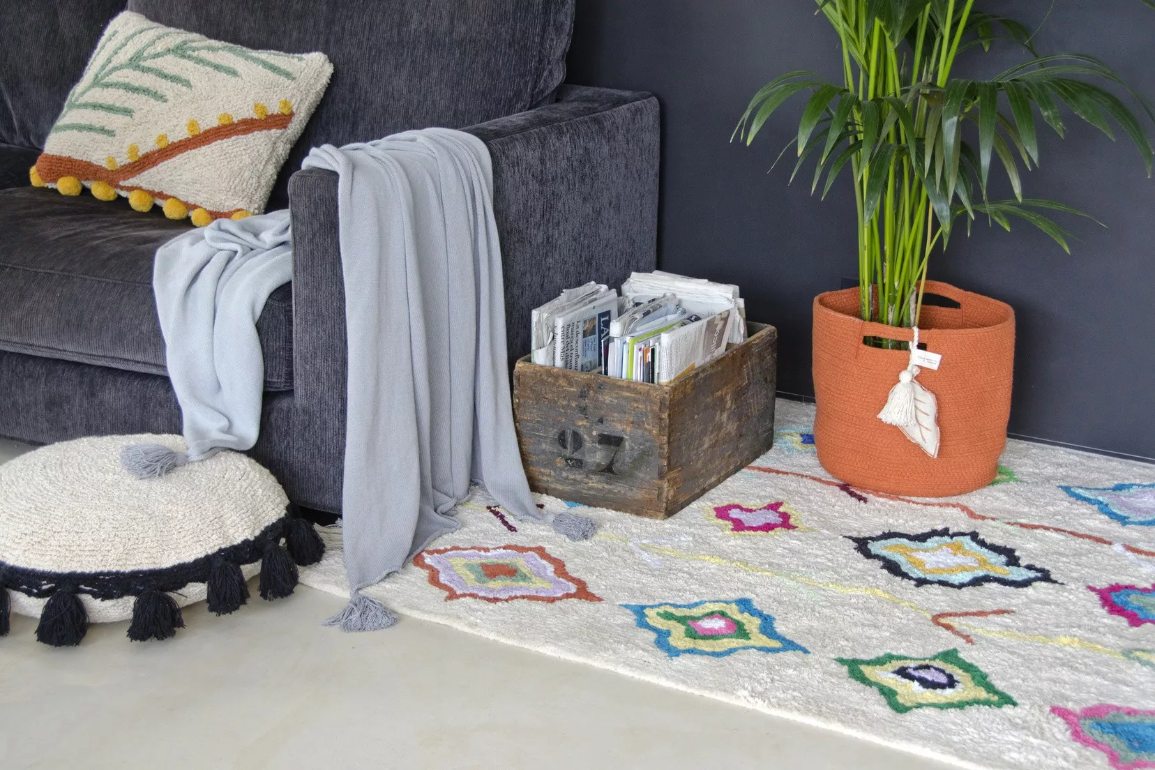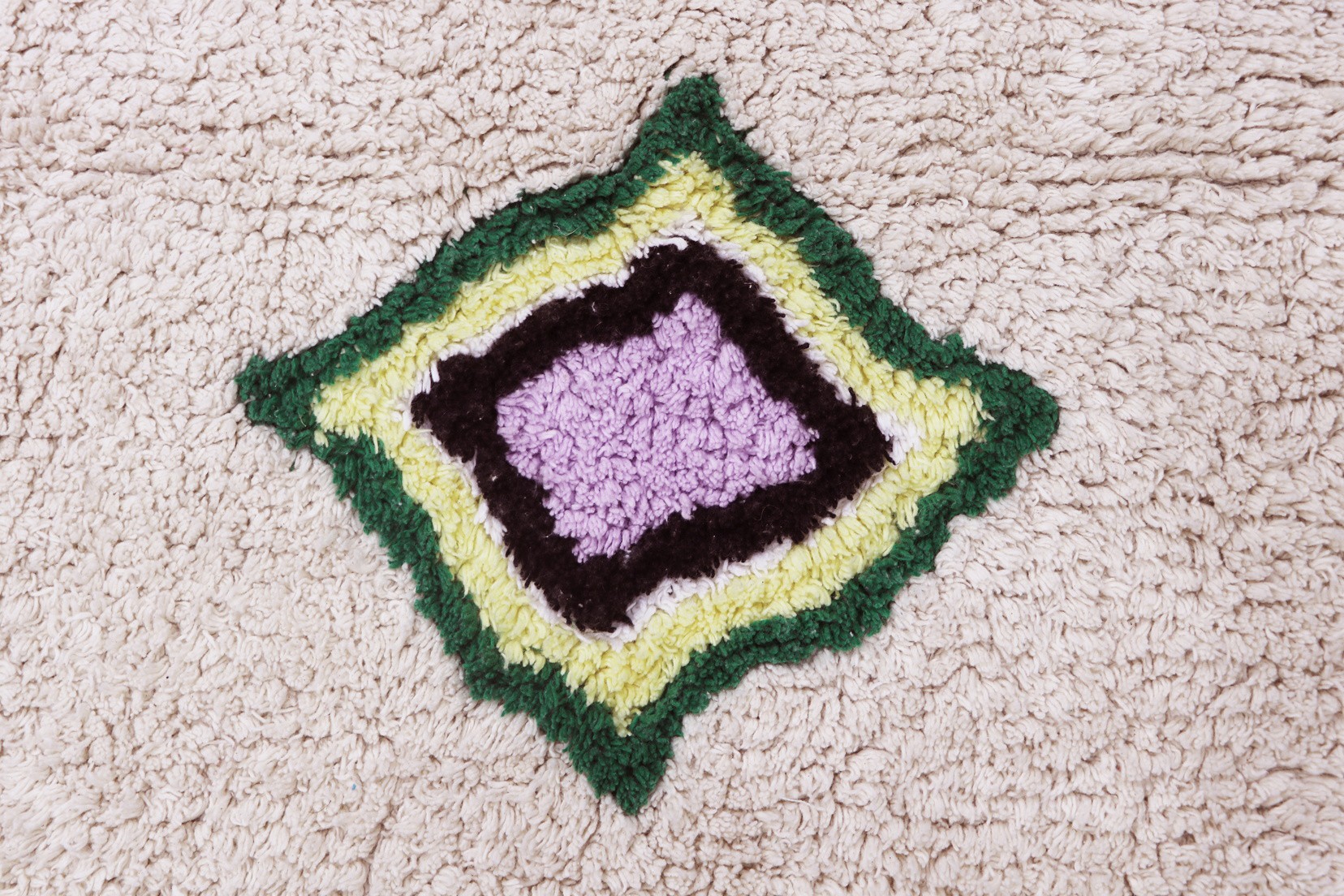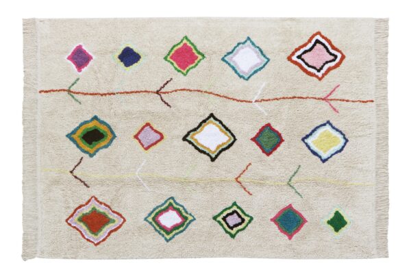 Prostokątny dywan bawełniany nadający się do prania z jasnym, wielokolorowym wzorem diamentowym inspirowanym berberyjskim wzorem, który wyróżnia się na naturalnym tle.