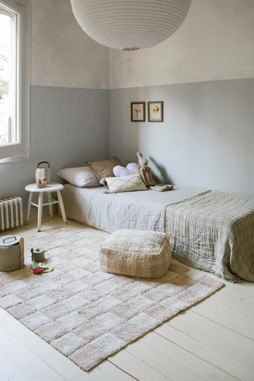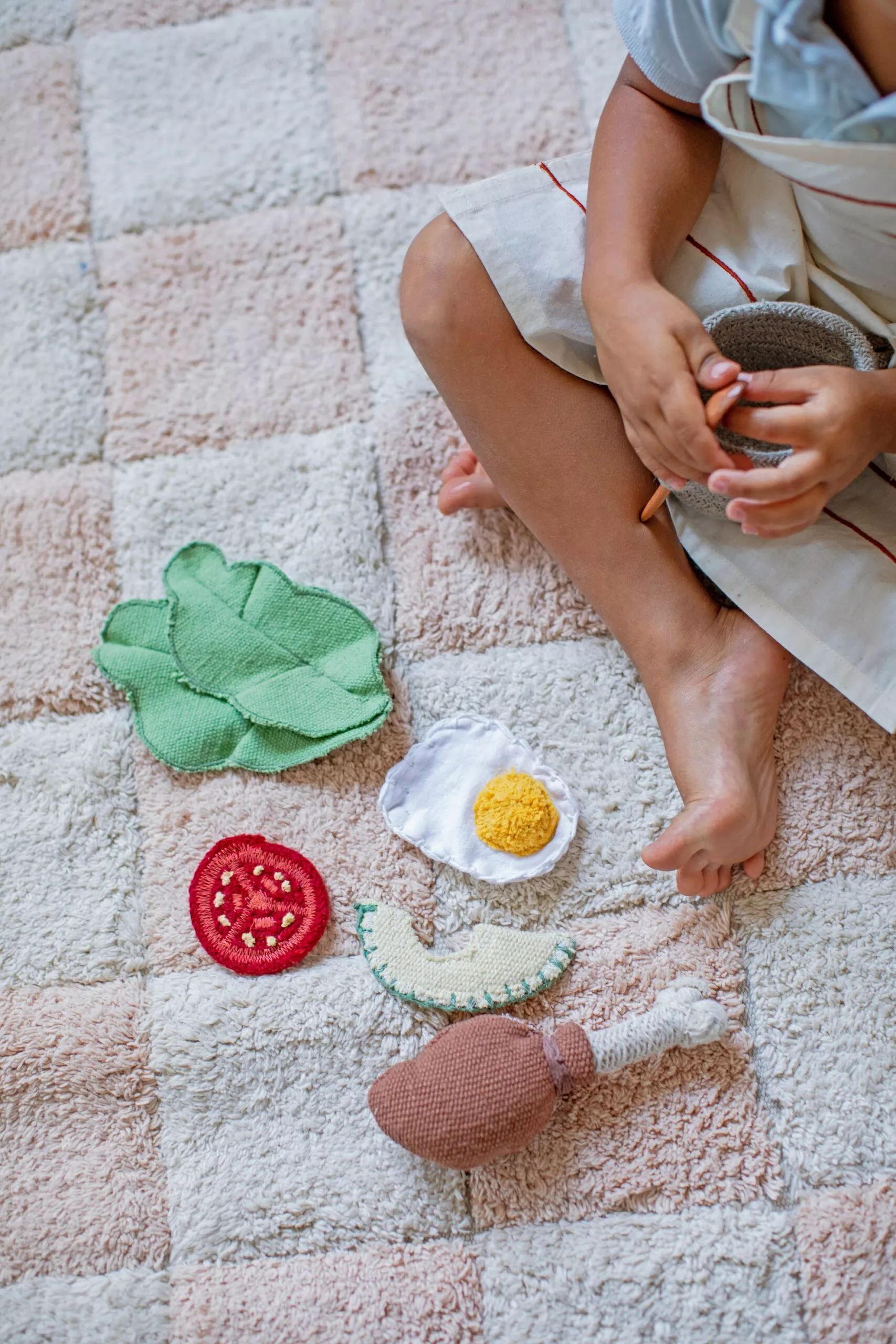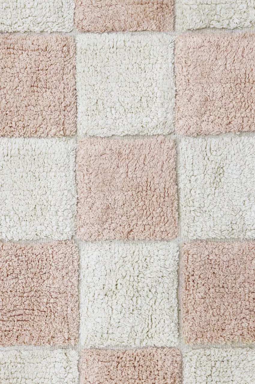 Ten bawełniany dywan do prania w pralce ma wzór inspirowany vintage płytkami kuchennymi w szachownicę.