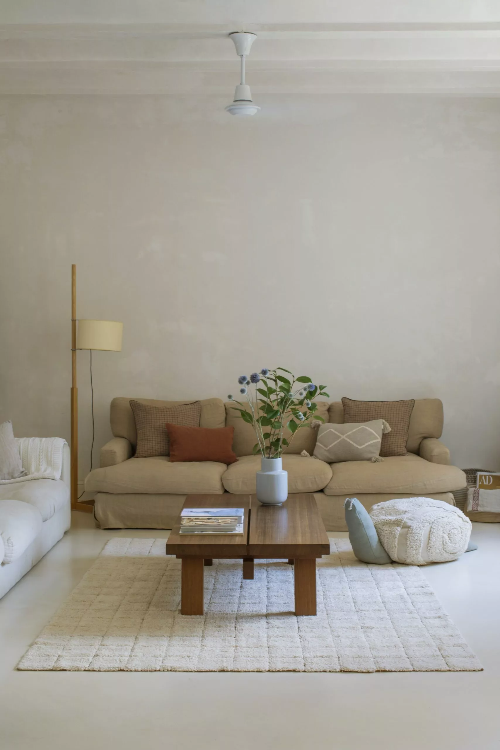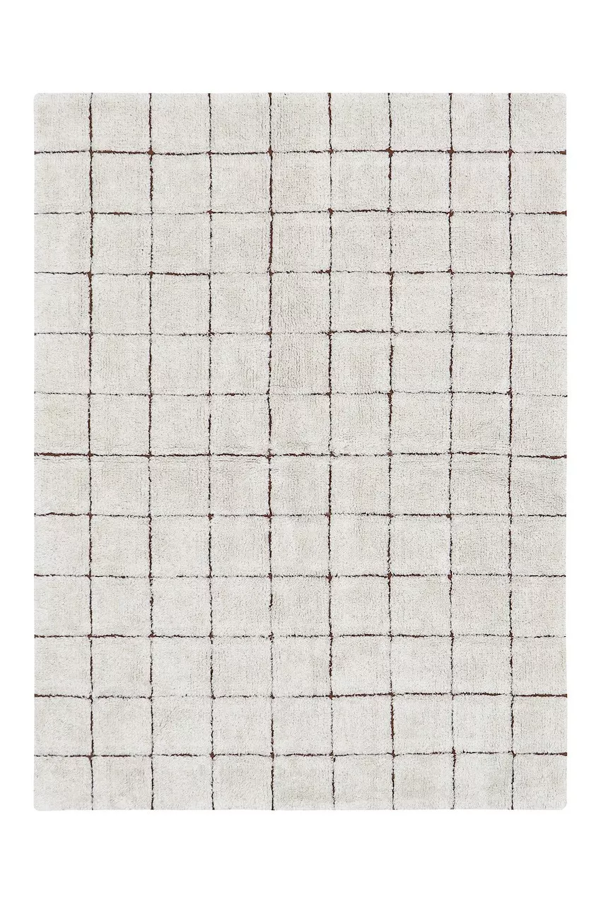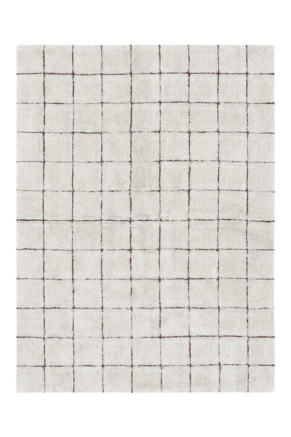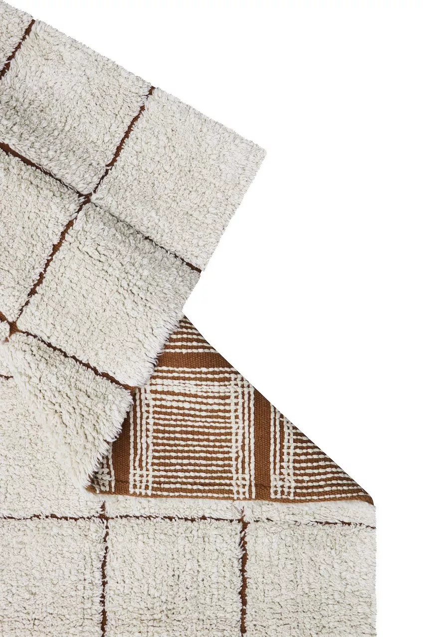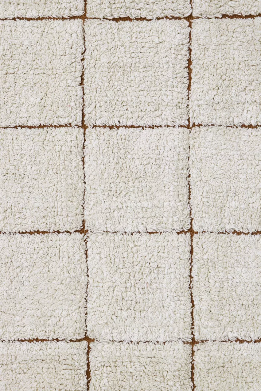 Dywan ma prosty wzór mozaiki w naturalnym kolorze na podstawie z płótna w kolorze toffi, które zostało częściowo odsłonięte, aby naśladować fugi.