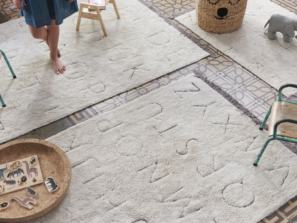 Prostokątny dywan RugCycled ABC w naturalnej kolorystyce idealnie sprawdzi się w pokoju dziecka. Miękkie sylwetki liter są niewypełnione, starannie zarysowane przez naszych rzemieślników, ukazując kontrastową podstawę płótna. Dywan wykończony jest 5 cm frędzlami wychodzącymi z płótna.
