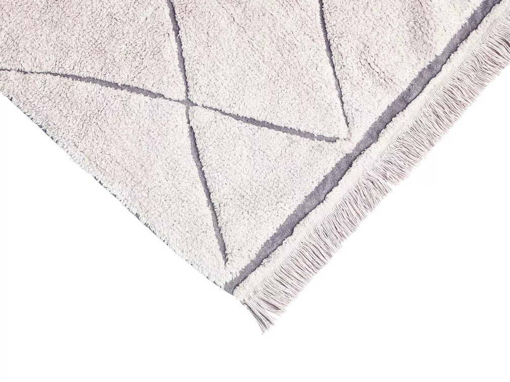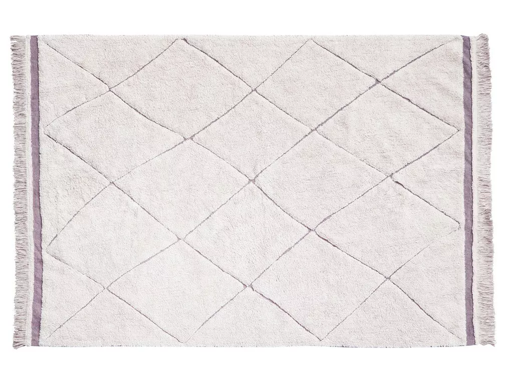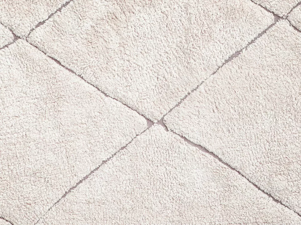 Nasz najlepiej sprzedający się dywan Bereber, teraz stworzony w nowej wersji w ramach naszego programu zero waste. Płótno tkane jest z przędzy wykonanej ze złomu tekstylnego i resztek poprodukcyjnych, a na wierzchu nasz charakterystyczny berberyjski wzór jest tkany wyłącznie z niefarbowanej, miękkiej, naturalnej bawełny. Wzór powstaje poprzez kontrast włosia i bezwłosia, pozostawiając płótno lekko widoczne. Dywan kończy się rzędem frędzli o długości 7 cm w naturalnym kolorze na krawędziach.