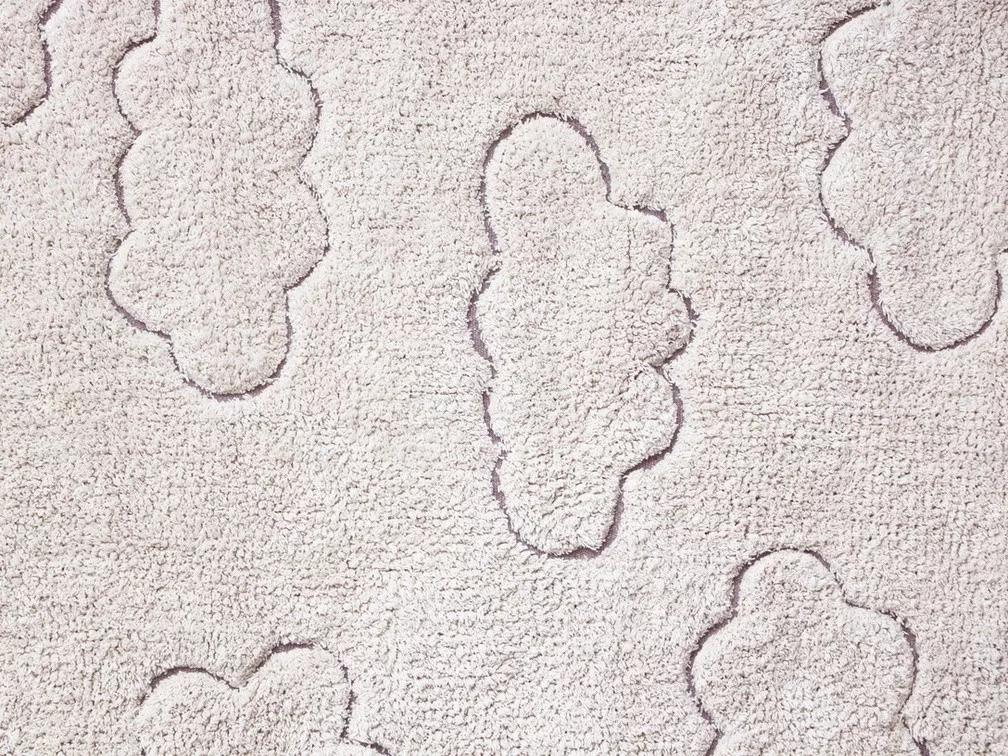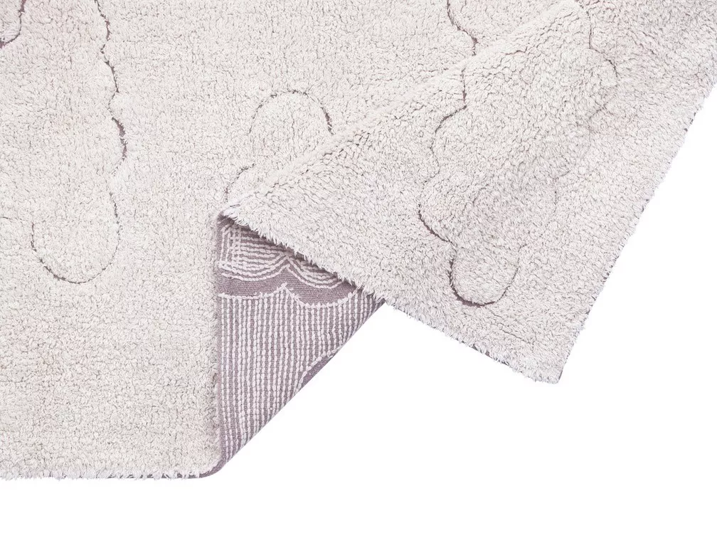 Nasz klasyczny dywan Clouds teraz w nowej, całkowicie naturalnej wersji kolorystycznej. Podstawa dywanu z przetworzonego materiału tekstylnego i ścinków z naszej produkcji. Wzór chmurki jest zszywany przy użyciu miękkiego, niebarwionego naturalnego włosia bawełnianego. Delikatne kształty chmur są tworzone poprzez kontrast włosia i bezwłosia, pozostawiając widoczne części podstawy płótna.