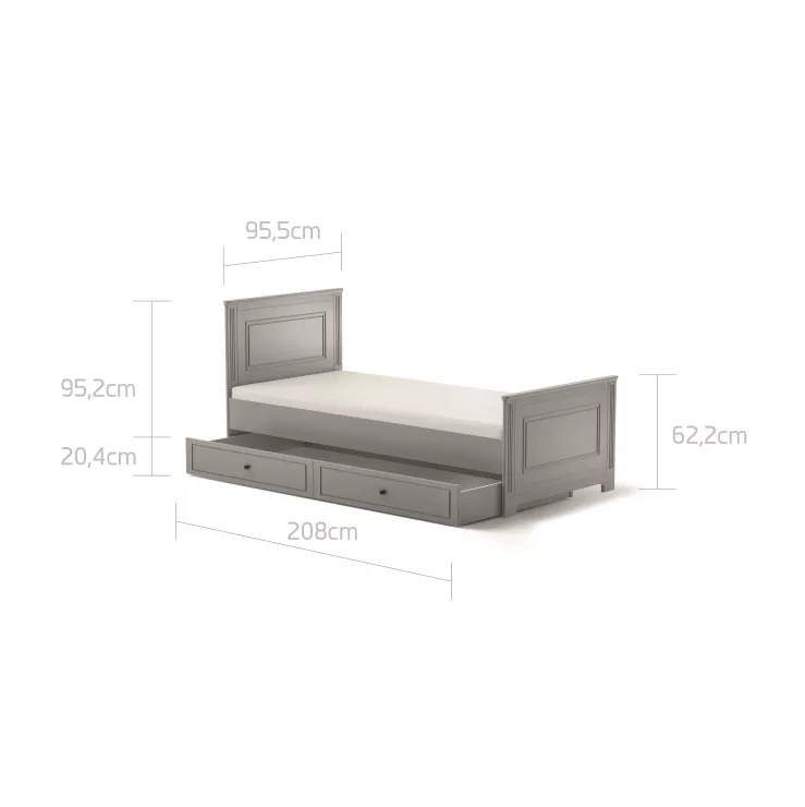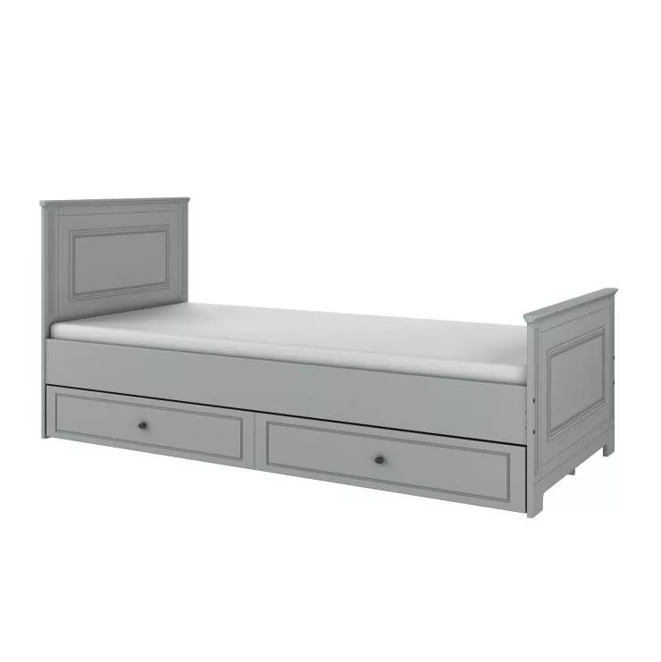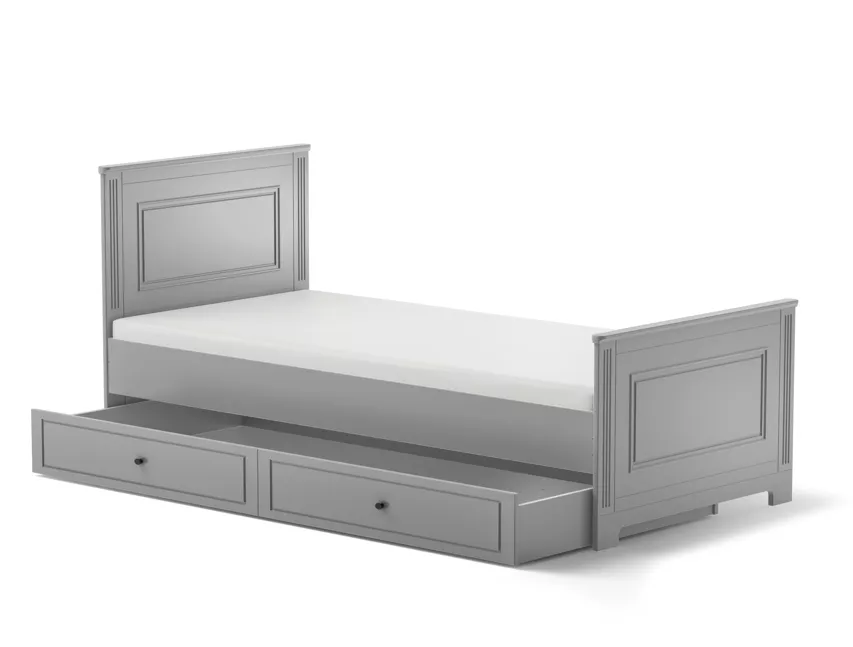 Wraz z rosnącym dzieckiem, kolekcja Ines rozrasta się o łóżko idealne dla starszego dziecka (200 cm x 90 cm). Standardowe wymiary łóżka sprawiają, że dopasowanie do niego odpowiedniego materaca, czy zakup wszelkiego rodzaju tekstyliów nie będą stanowiły problemu. Łóżko ozdobione zostało eleganckim zagłówkiem i zanóżkiem. Dla lepszej organizacji pokoju i przestrzeni łóżko posiada szufladę, która z powodzeniem pomieści pościel, a także może pełnić funkcję dodatkowego spania. Sama szuflada, dzięki dwóm uchwytom łatwo się wysuwa i nie będzie stanowiła problemu nawet dla młodszego użytkownika łóżka.