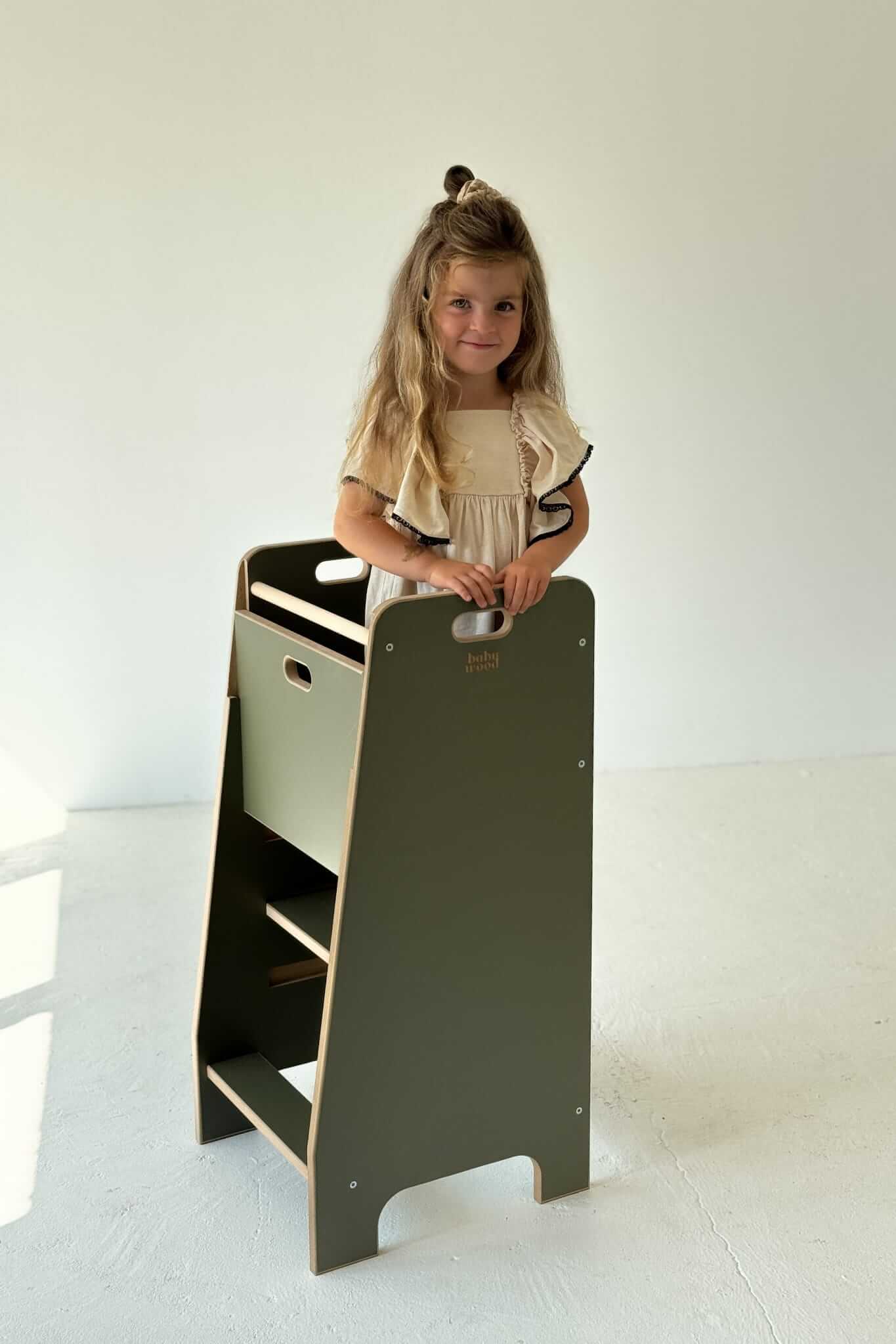 Kitchen Helper Comfort M został zaprojektowany z myślą o rodzicach, którzy pragną włączyć dziecko do codziennych obowiązków i jednocześnie zadbać o jego bezpieczeństwo. Ten solidny podest w odcieniu eleganckiej oliwki nie tylko ułatwia wspólne gotowanie, ale także pięknie komponuje się z nowoczesnymi i klasycznymi wnętrzami kuchennymi.