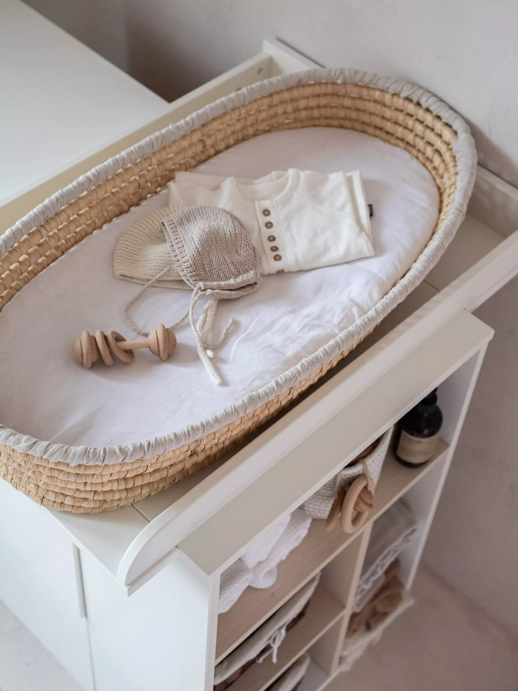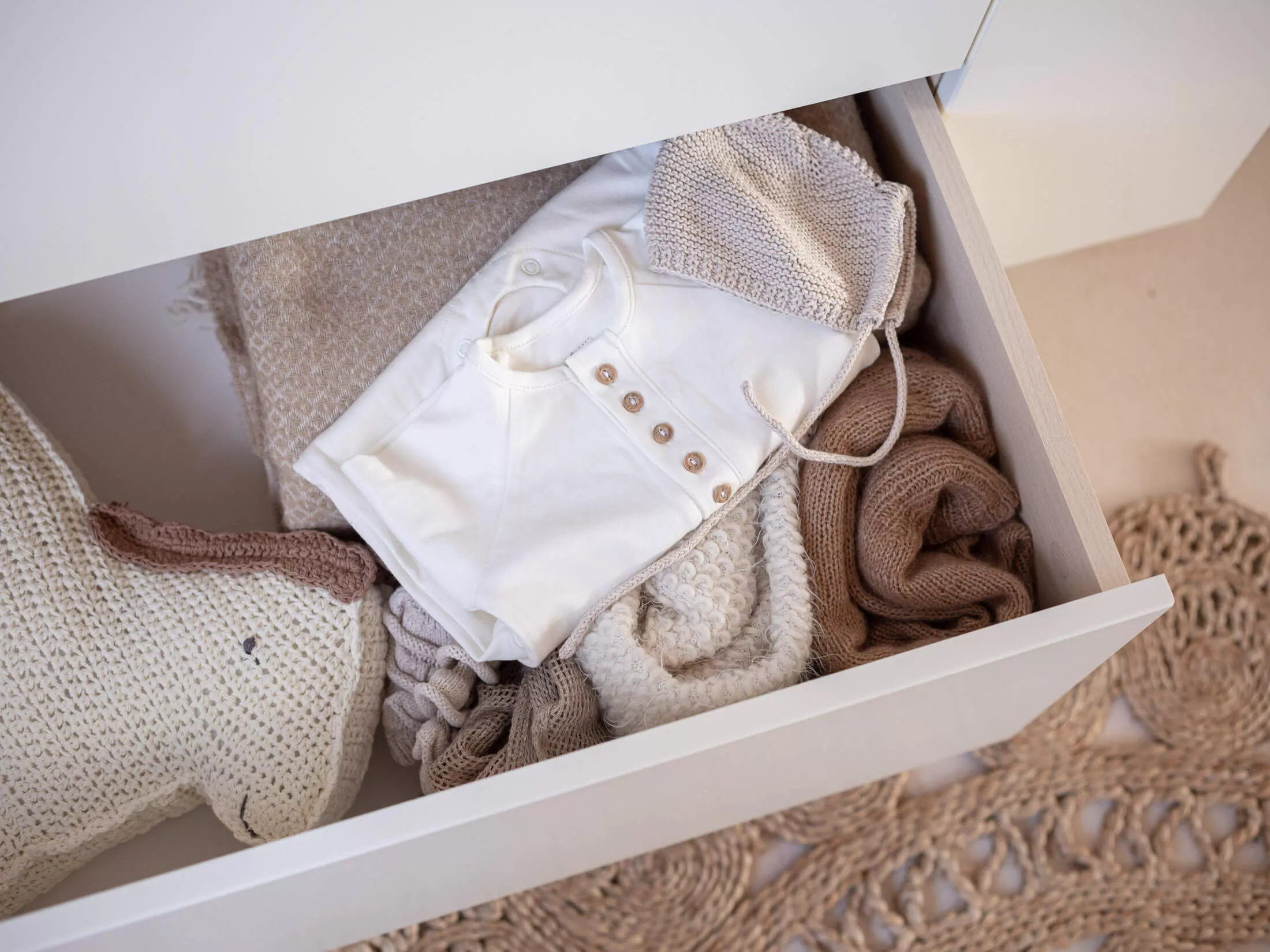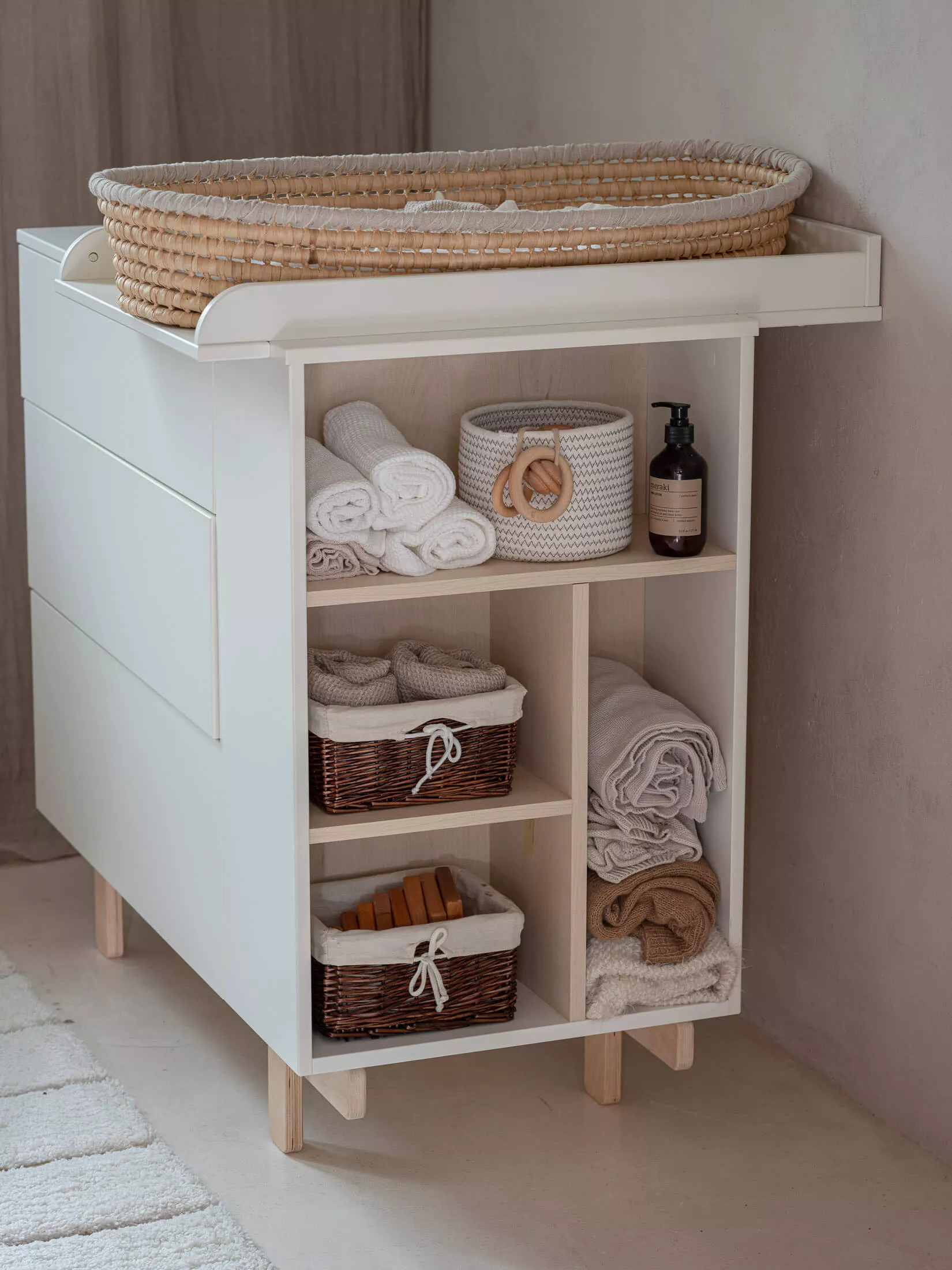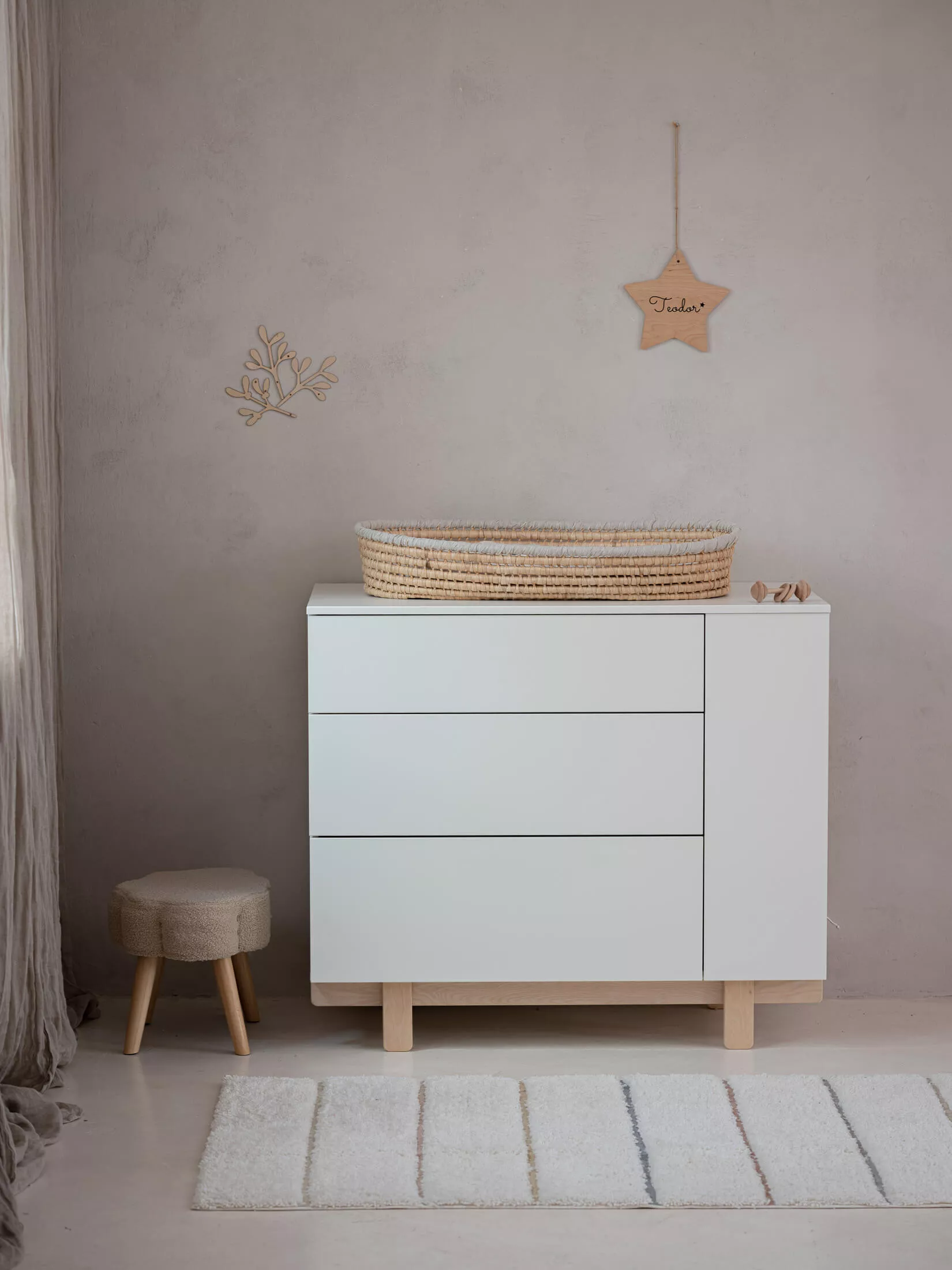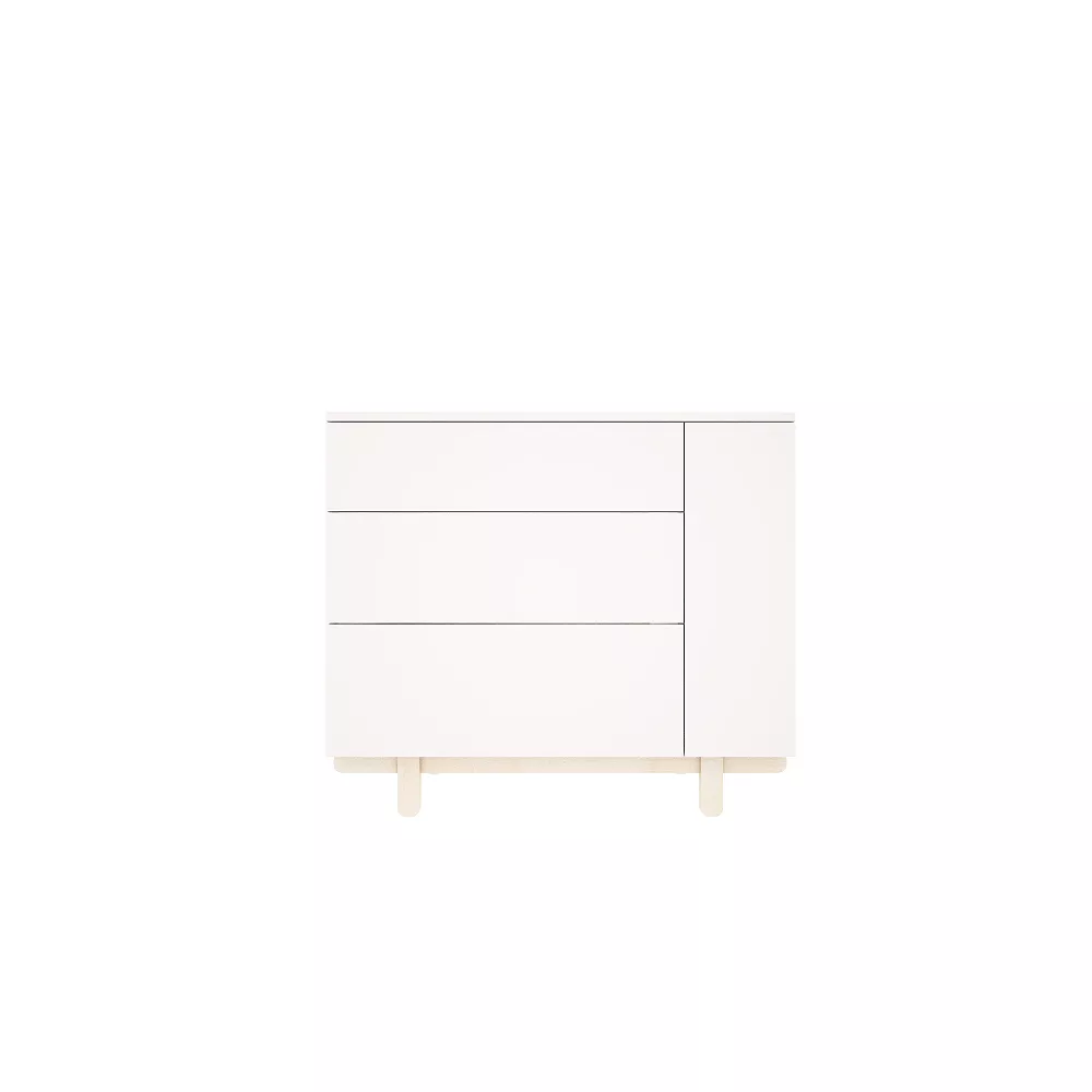 Dzięki trzem pojemnym szufladom zapewnia ona wiele miejsca do przechowywania. Szuflady wyposażone są w wysokiej jakości prowadnice z systemem push-to-open, dzięki którym za pomocą obustronnego kliknięcia można otworzyć każdą z nich. W boku komody znajduje się regał będący nie tylko dodatkowym miejscem do przechowywania ale również elementem dekoracyjnym.