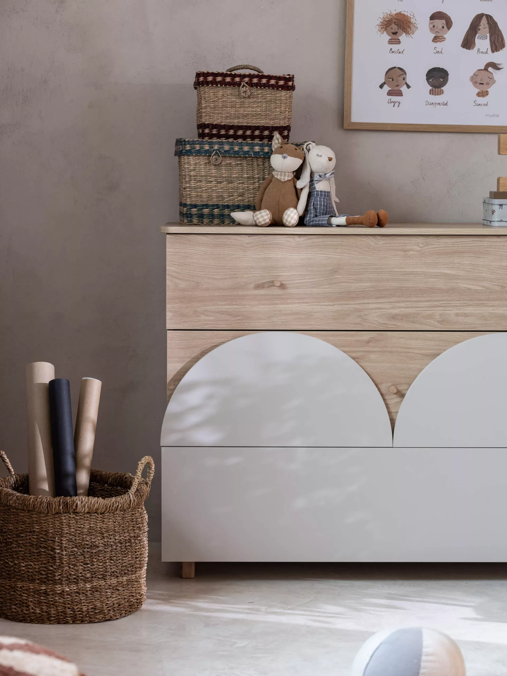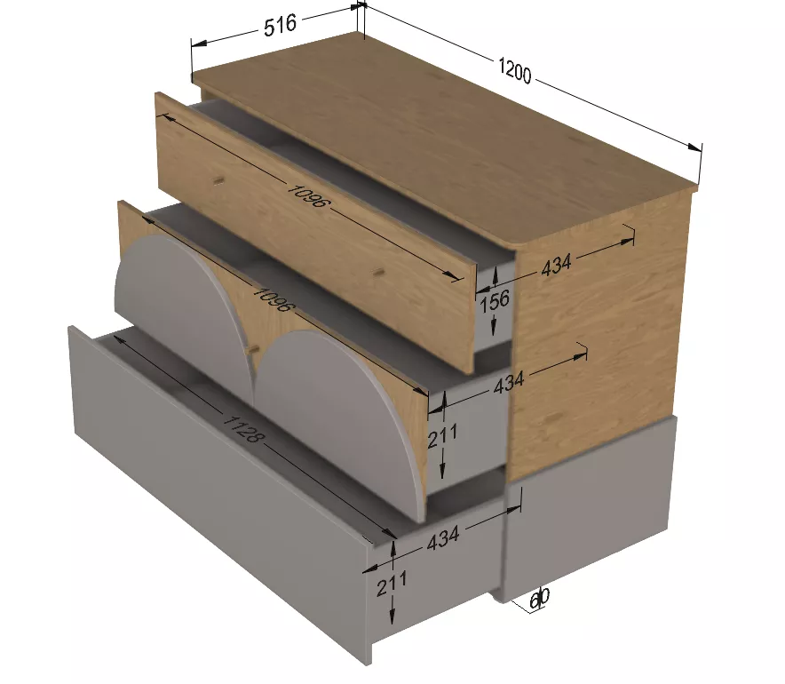 płyta meblowa, mdf, drewno dębowe (uchwyty, nóżki) – płyty produkowana zgodnie z normą EN71/3 – norma dotycząca mebli dziecięcych oraz zabawek