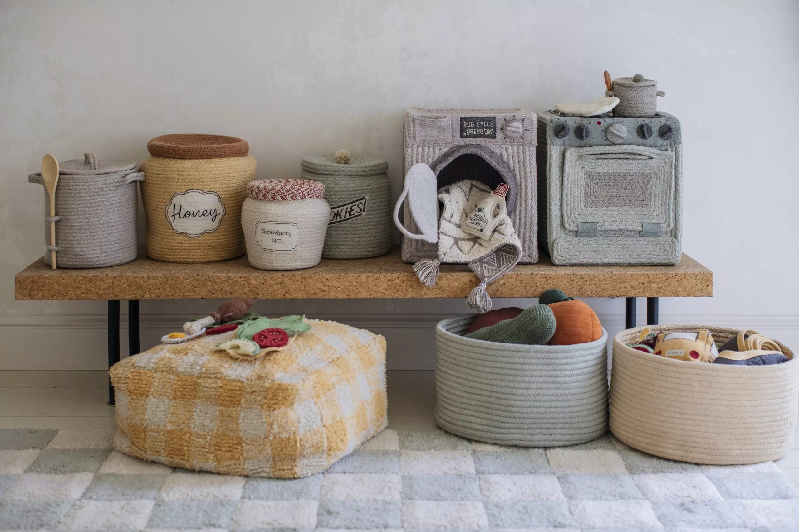Mały kosz do przechowywania przypominający tradycyjny słoik po dżemie z babcinej kuchni. Idealny do przechowywania małych zabawek i drobiazgów dla dzieci, jest wykonany ręcznie z plecionych sznurków z przetworzonych włókien butelek PET zmieszanych z naturalną bawełną. Garnek jest w naturalnym odcieniu bawełny, a pokrywka ma terakotowy wzór Vichy. Z przodu wszyta jest nadrukowana metka z napisem „Dżem truskawkowy”.