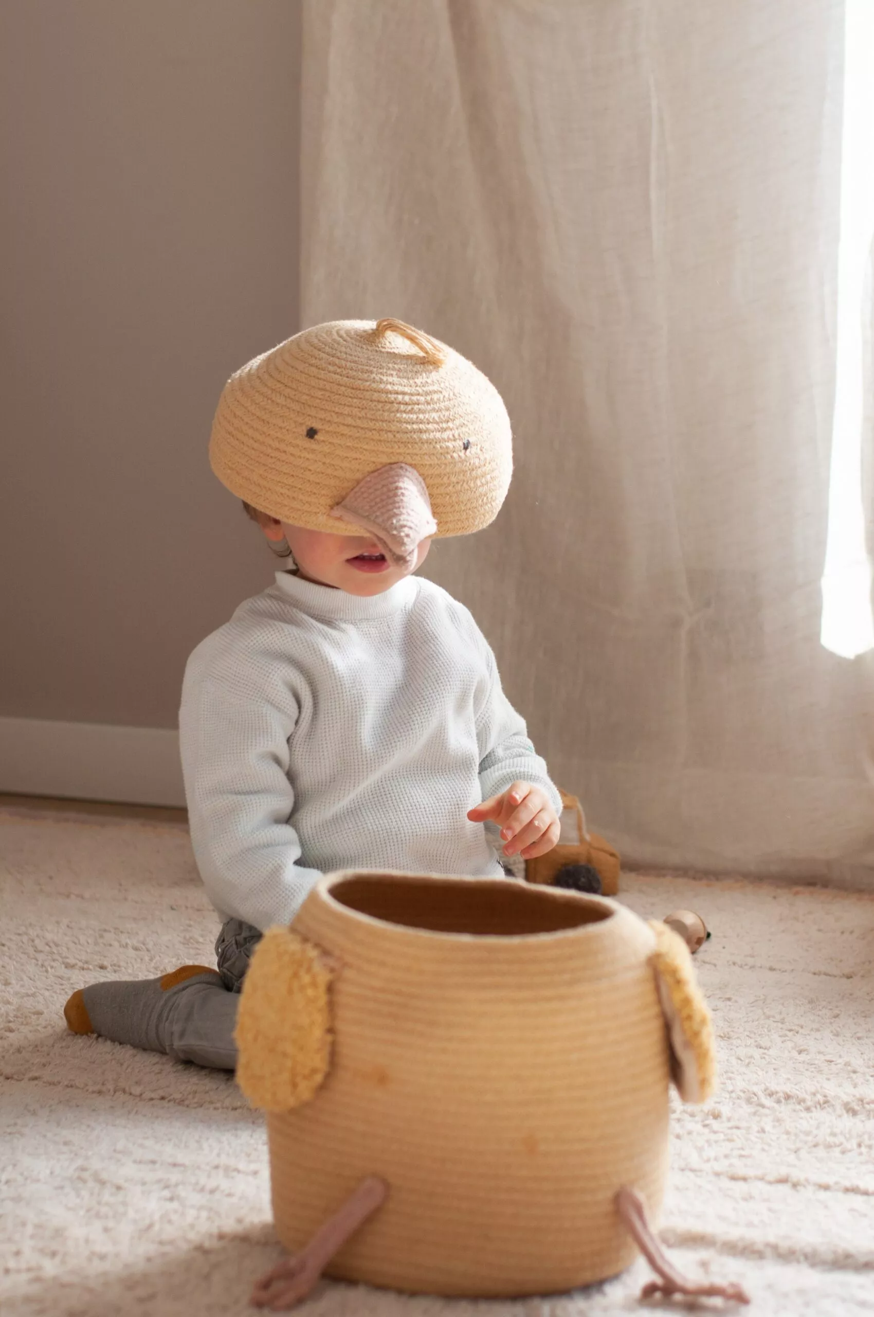 Wykonany ręcznie przy użyciu plecionego sznurka z włókien pochodzących z recyklingu butelek PET zmieszanych z naszą bawełnianą przędzą w miękkim złotym kolorze, koszyk Charlie the Chicken ma dziób i plecione nogi w kolorze Rose oraz tuftowane żółte skrzydła.