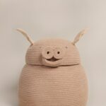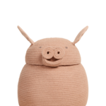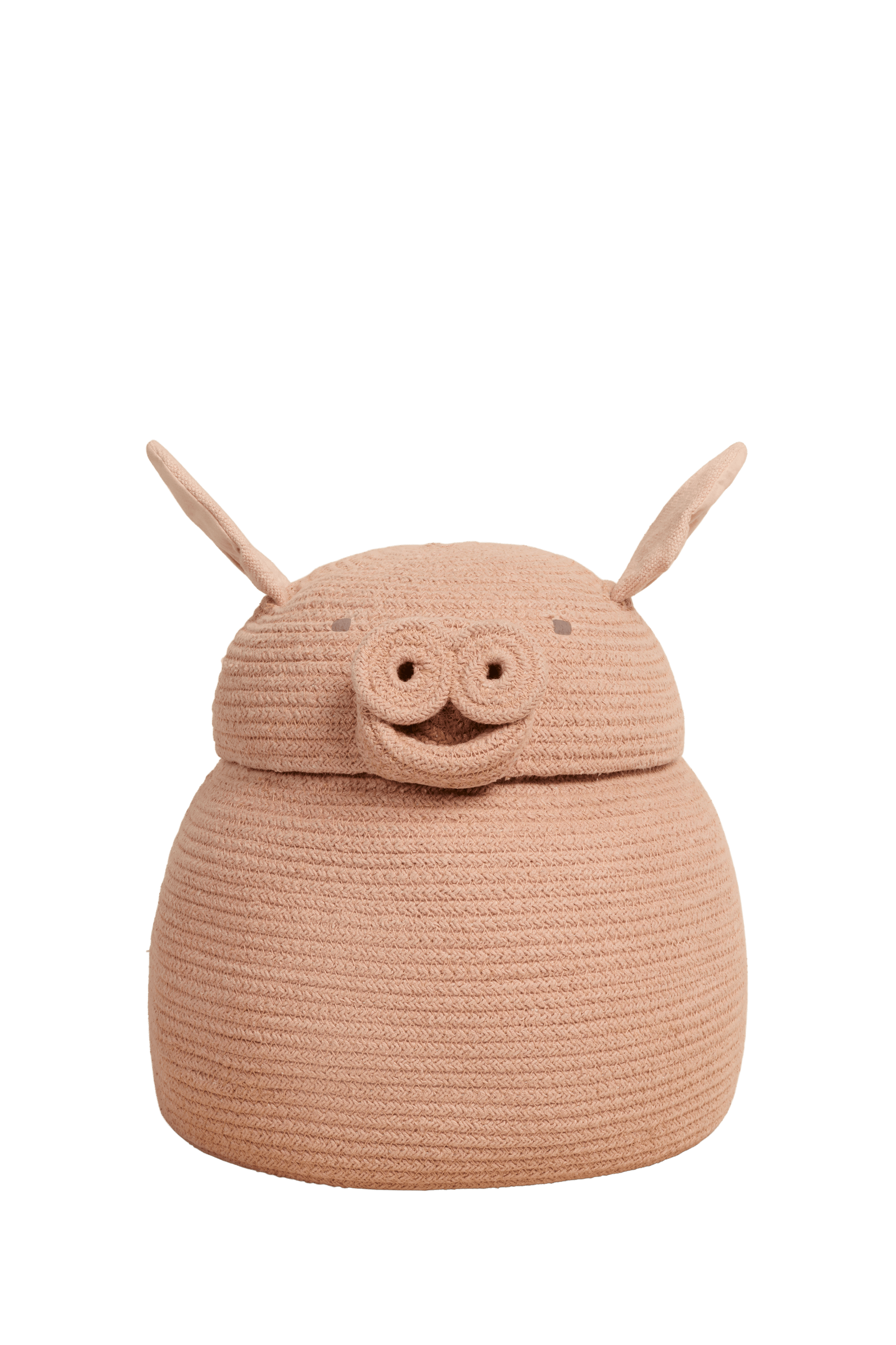 Z zaokrąglonym brzuchem dla dodatkowej przestrzeni i plecionymi kółkami jako nosek, koszyk Peggy the pig jest wykonany ręcznie przy użyciu plecionych sznurków z włókien z recyklingu butelek PET zmieszanych z naszą bawełną w kolorze Rose. Różowe płócienne uszy i zawinięty ogonek dopełniają wygląd tego uroczego koszyka.