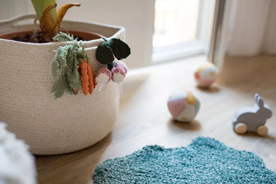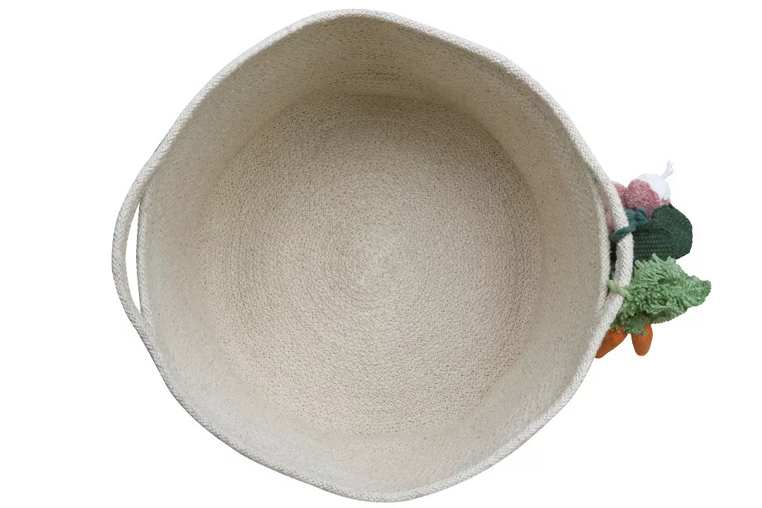 Koszyk wykonany z plecionych sznurków bawełnianych w kolorze naturalnym. Kosz ma dwa uchwyty i jest ozdobiony ręcznie robionymi dekoracjami w kształcie warzyw.