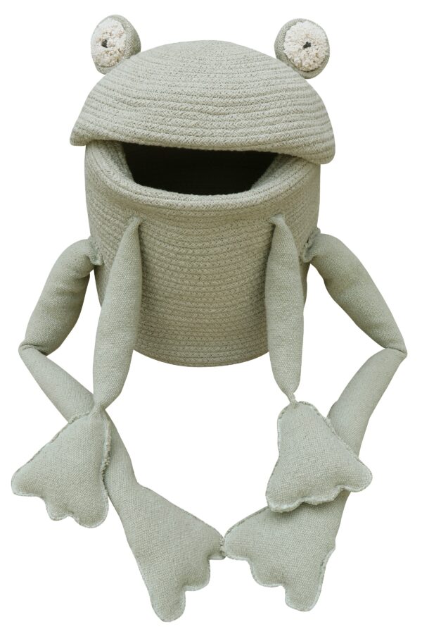 Jego owalna podstawa i wieczko są w całości wykonane ręcznie z plecionego bawełnianego sznurka w kolorze oliwkowo-zielonym. Dzieci będą bardziej skłonne do sprzątania, gdy zostaną poproszone o włożenie swoich zabawek z powrotem do pyska żaby!
