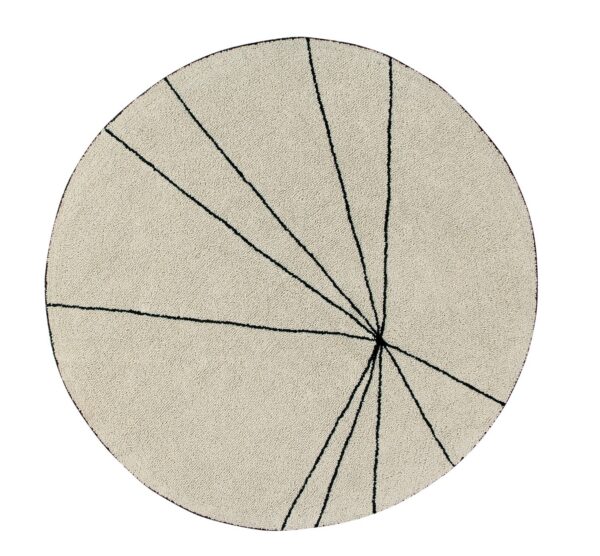 Kształt okrągły, proste czarne linie rozpoczynające się od tego samego punktu i tworzące motywy geometryczne o różnych rozmiarach. Wykonano techniką pętli, co zapewnia dodatkowy komfort i ciepło.