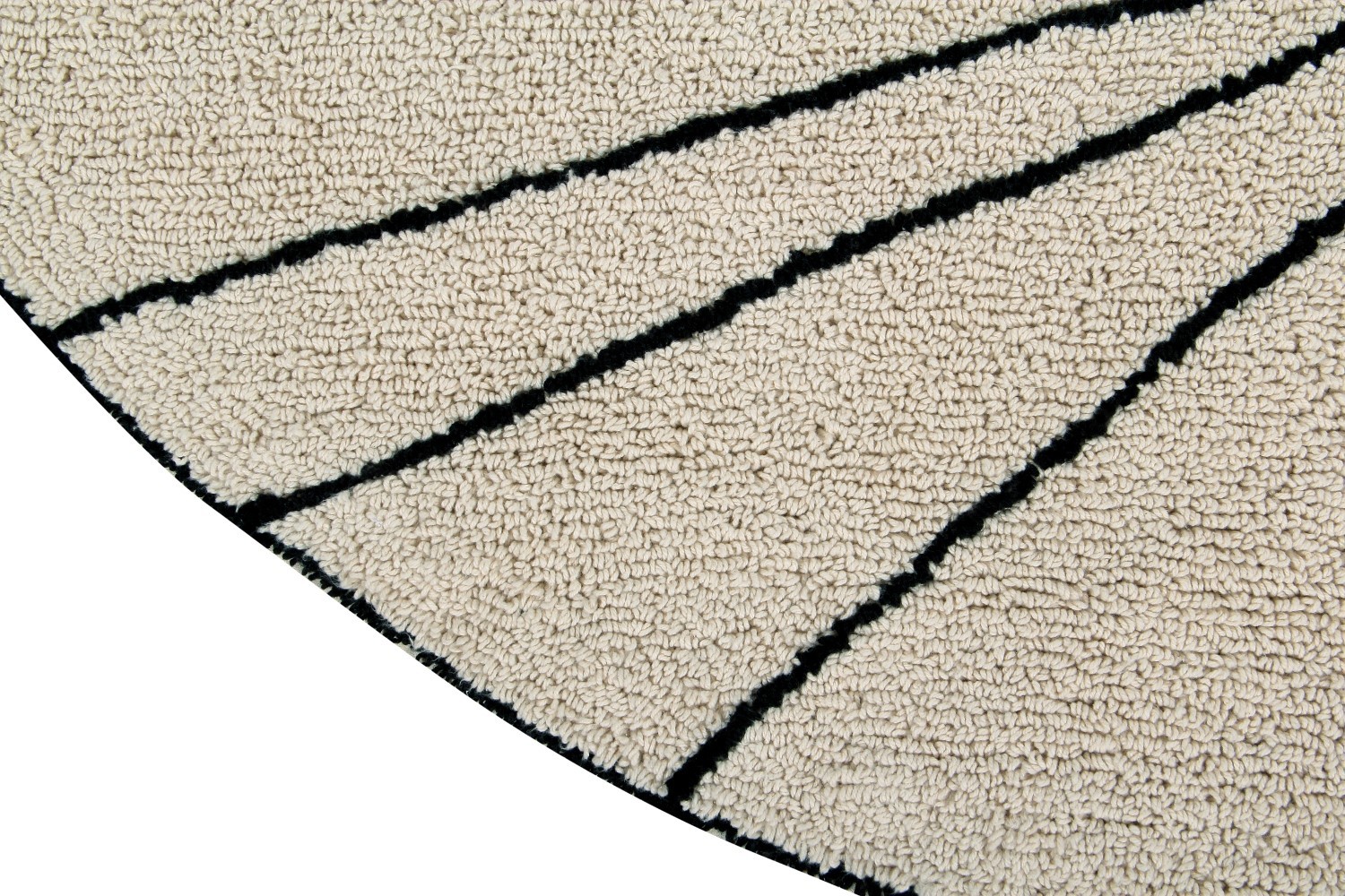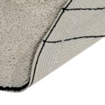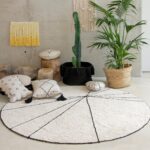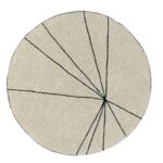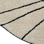 Kształt okrągły, proste czarne linie rozpoczynające się od tego samego punktu i tworzące motywy geometryczne o różnych rozmiarach. Wykonano techniką pętli, co zapewnia dodatkowy komfort i ciepło.