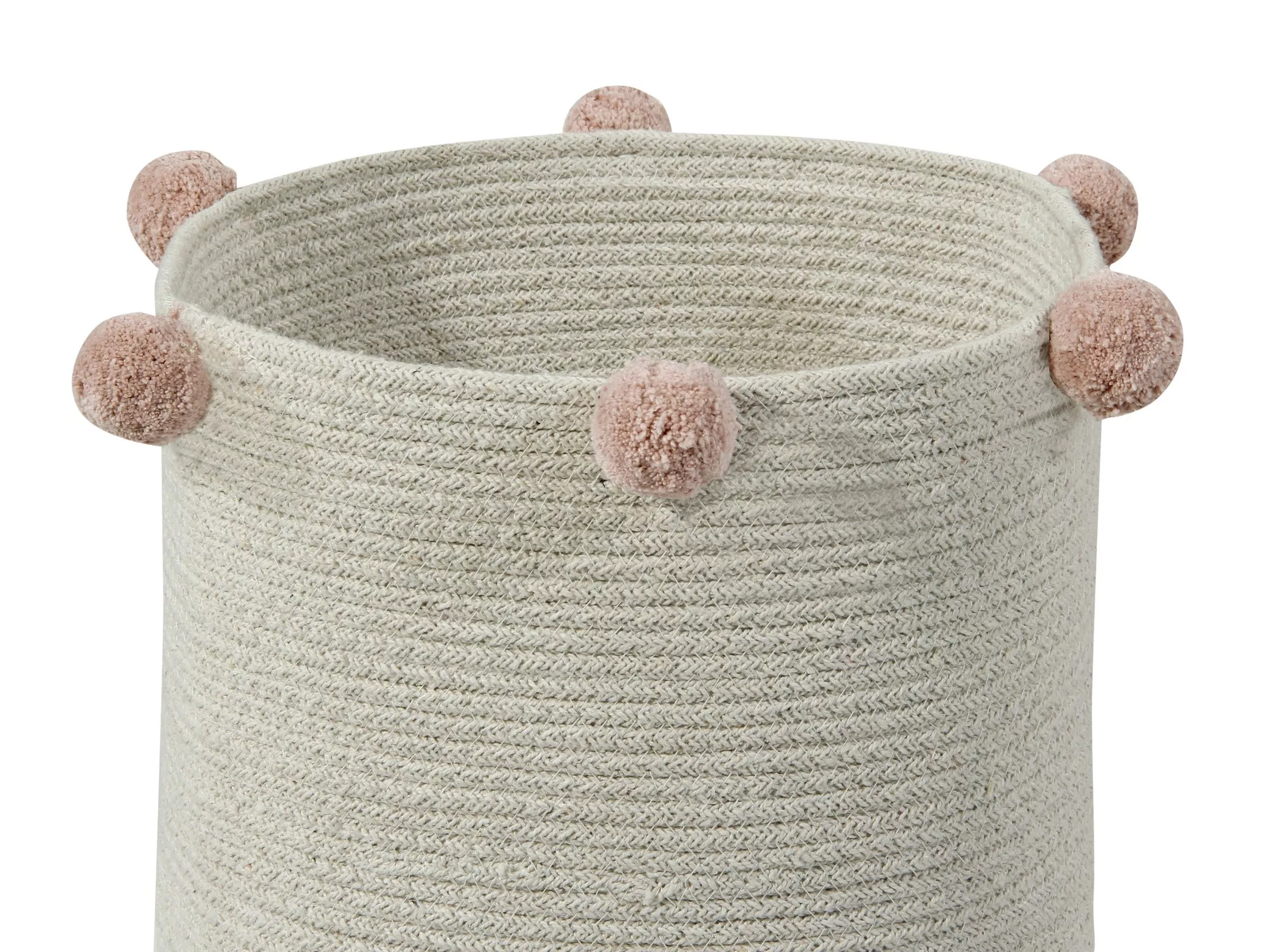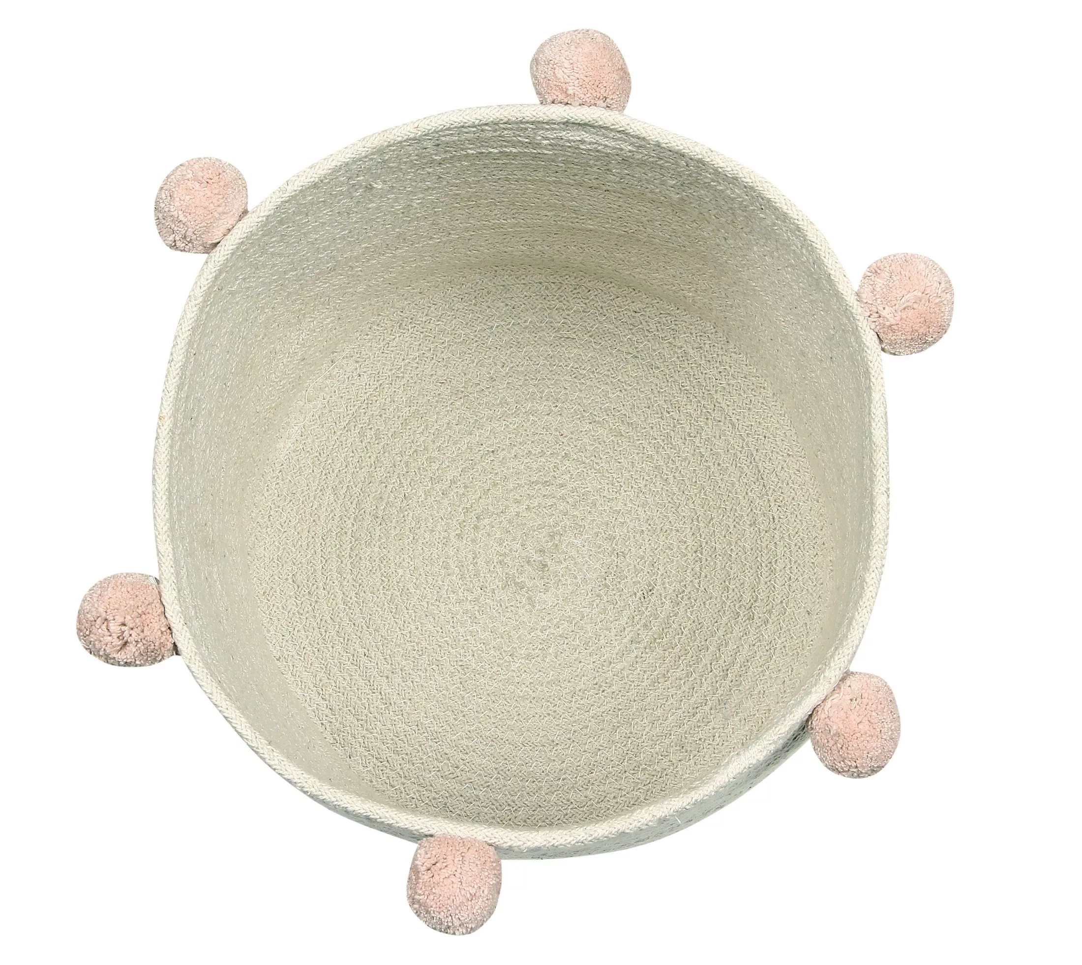 Bawełniane kule na bokach koszyków dodają wesołego i przyjemnego stylu w dekoracji pokoju