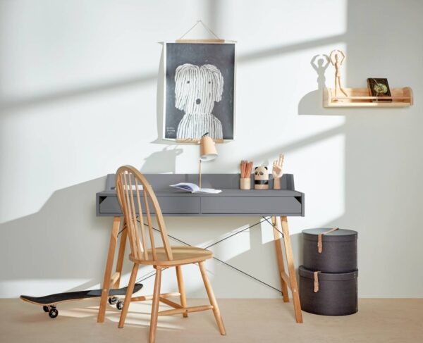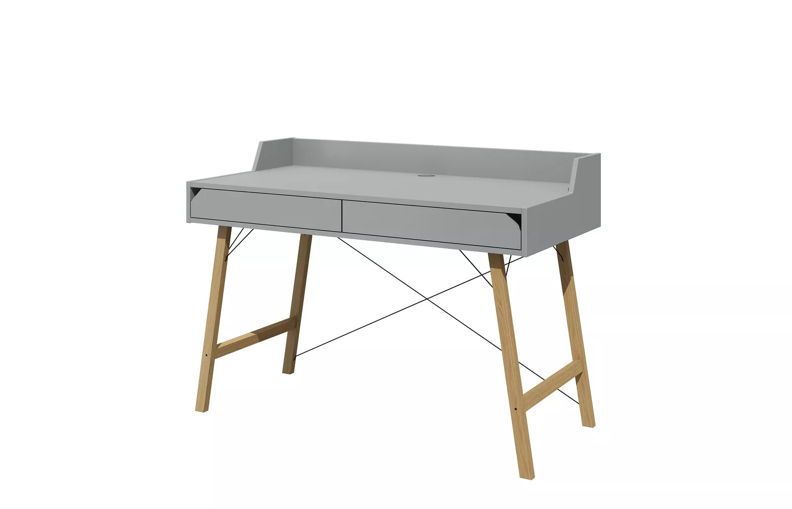 Biurko zaprojektowane z dbałością o szczegóły, proste w formie o minimalistycznym designie. Posiada dwie pojemne szuflady, ograniczenie blatu oraz otwór do przełożenia kabli, dzięki któremu utrzymasz na biurku porządek i unikniesz bałaganu w kablach.