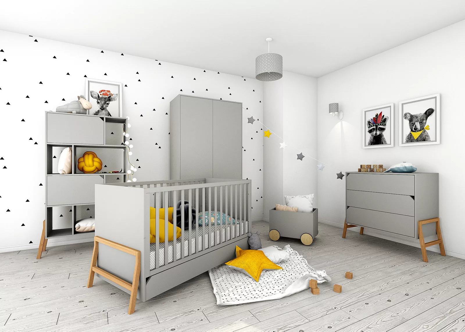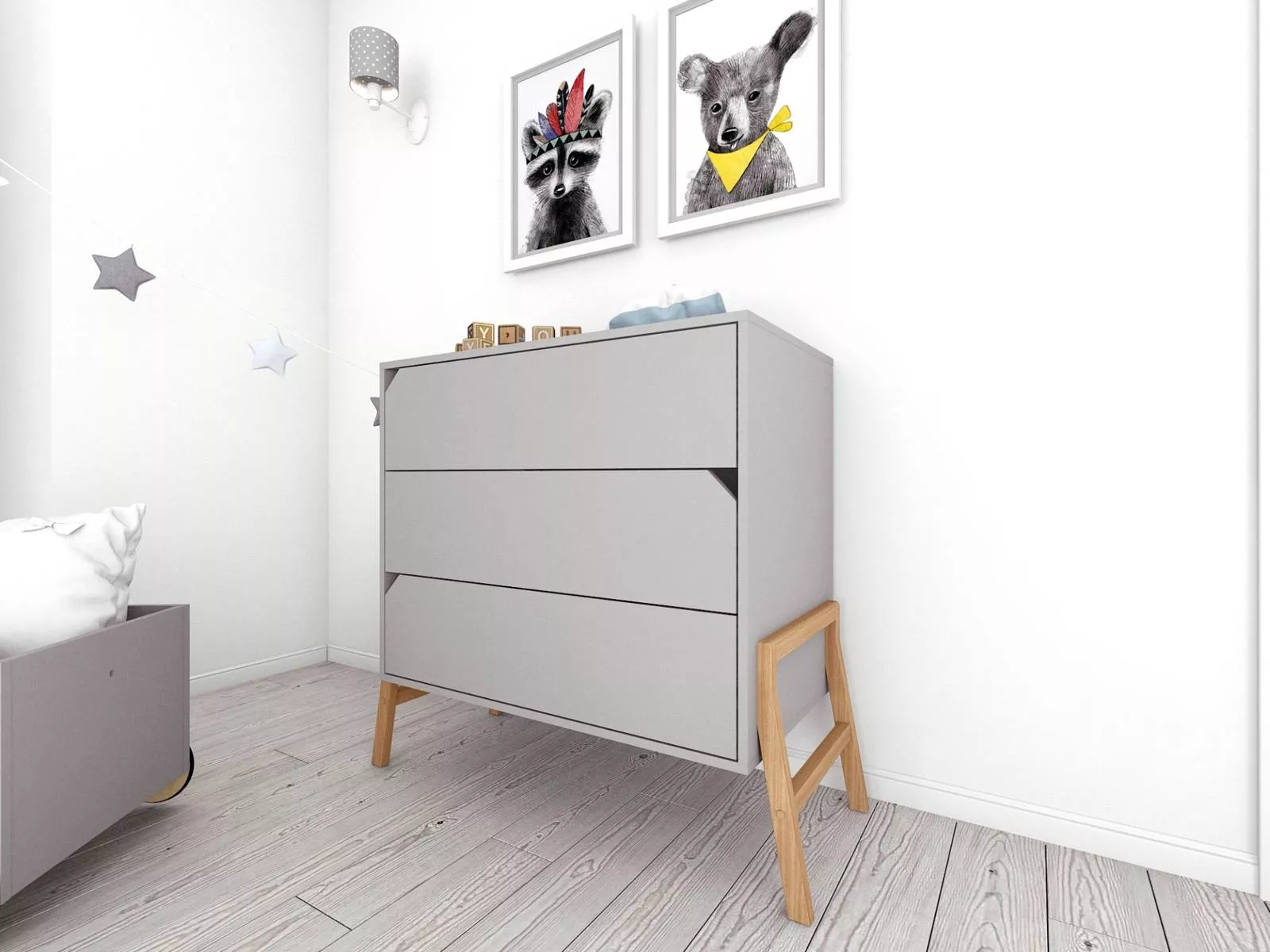 Obok łóżeczka, drugi najważniejszy mebel w pokoju dziecka. W kolekcji Lotta prezentujemy trzyszufladową, pojemną komodę. Idealnie pasuje do łóżeczka z tej samej serii, jest zbliżona do niego wysokością, dzięki czemu może stanowić miejsce, w którym trzymać można najpotrzebniejsze dziecięce akcesoria. Blat komody można wyposażyć w przewijak z tej samej kolekcji i umieścić po prawej, lewej lub na środku blatu komody.