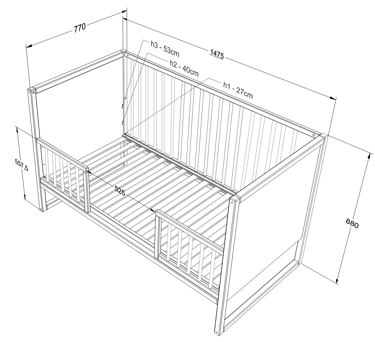 Łóżeczko TWEENS posiada 3 poziomy regulacji materaca, dodatkowo jedna z ramek bocznych posiada 3 wyjmowane lamelki aby umożliwić już starszemu dziecku samodzielne wychodzenie z łóżeczka.