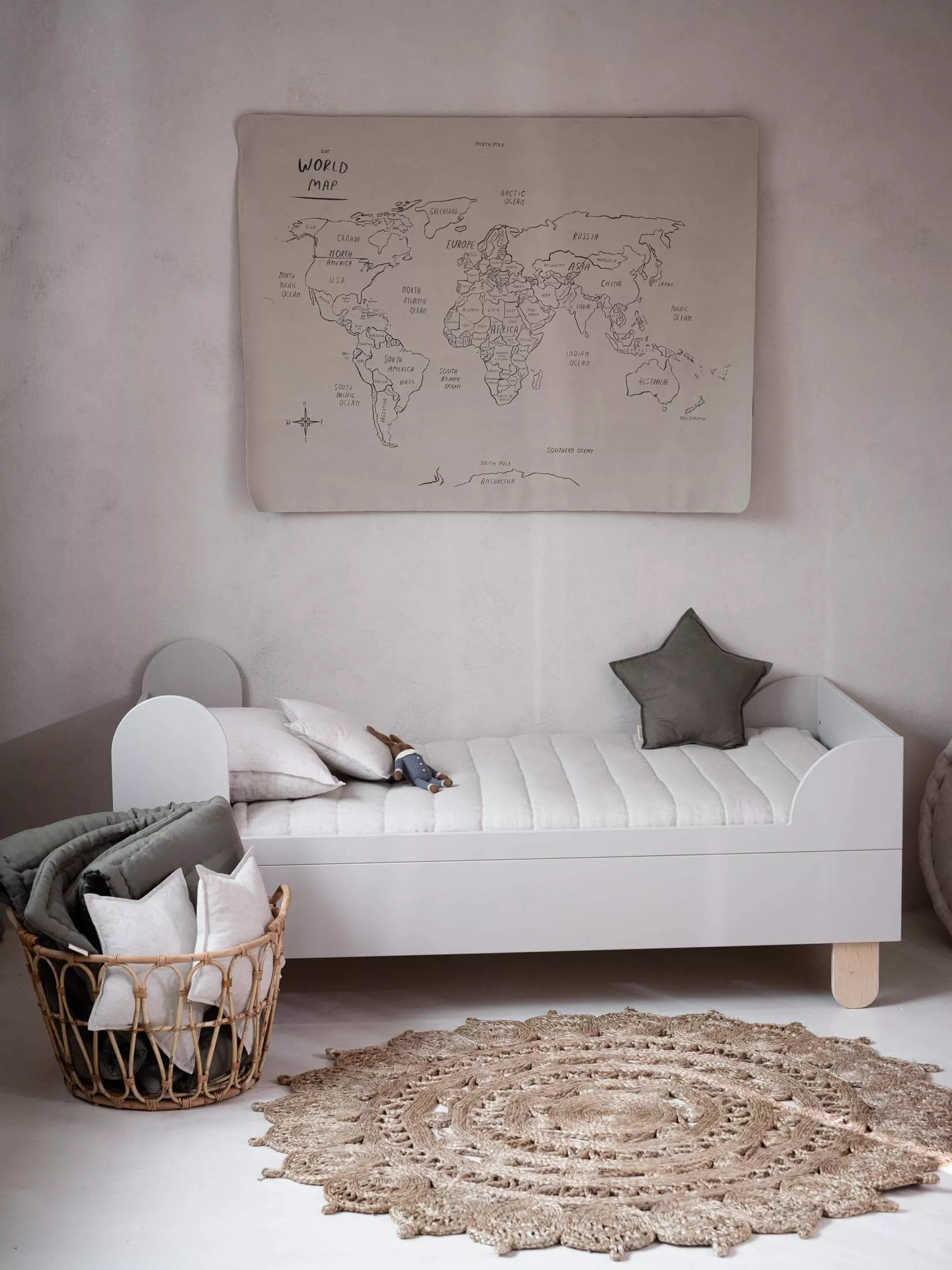 Do łóżka pasuje materac o rozmiarze 80 x 160 cm oraz wyposażone jest w stelaż pod materac.