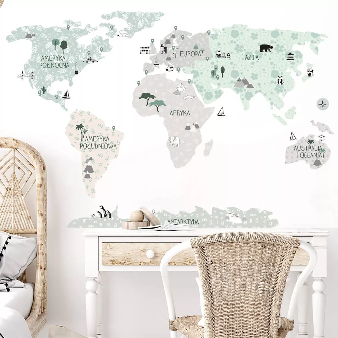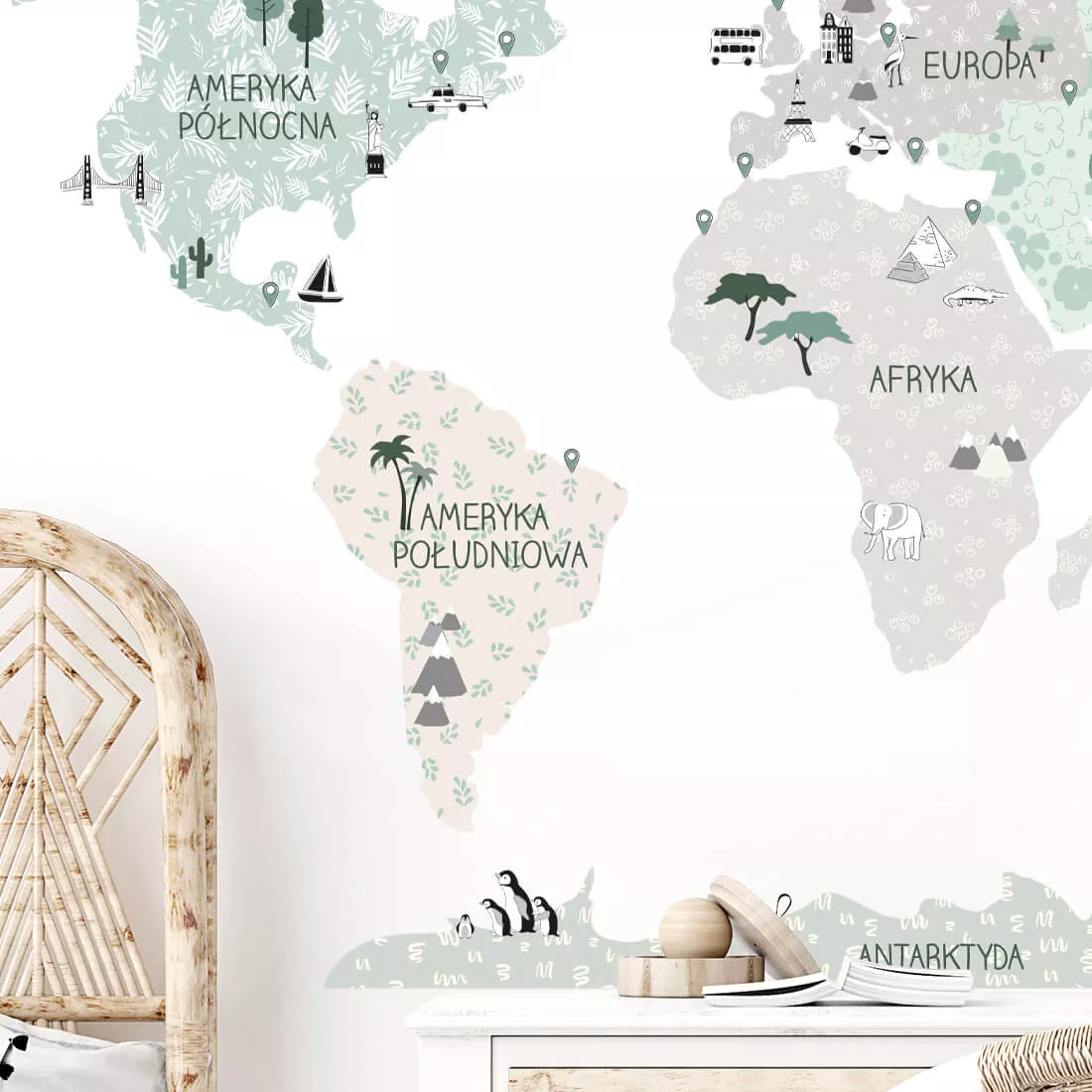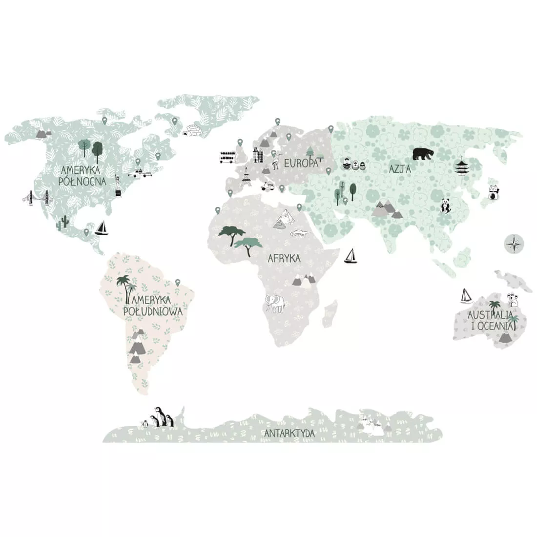 kontynenty, wyspy oraz elementy dodatkowe (edukacyjne).