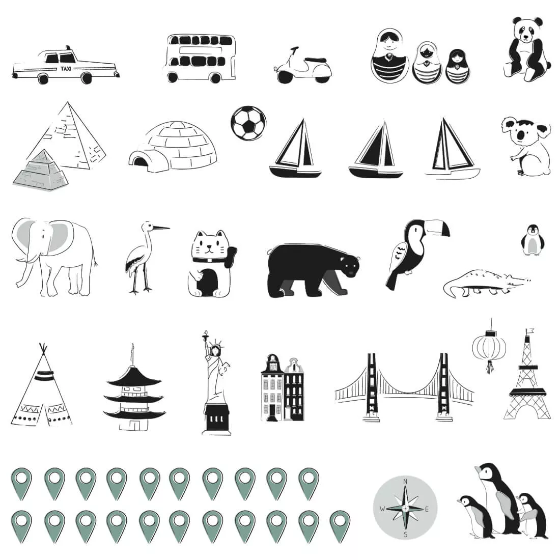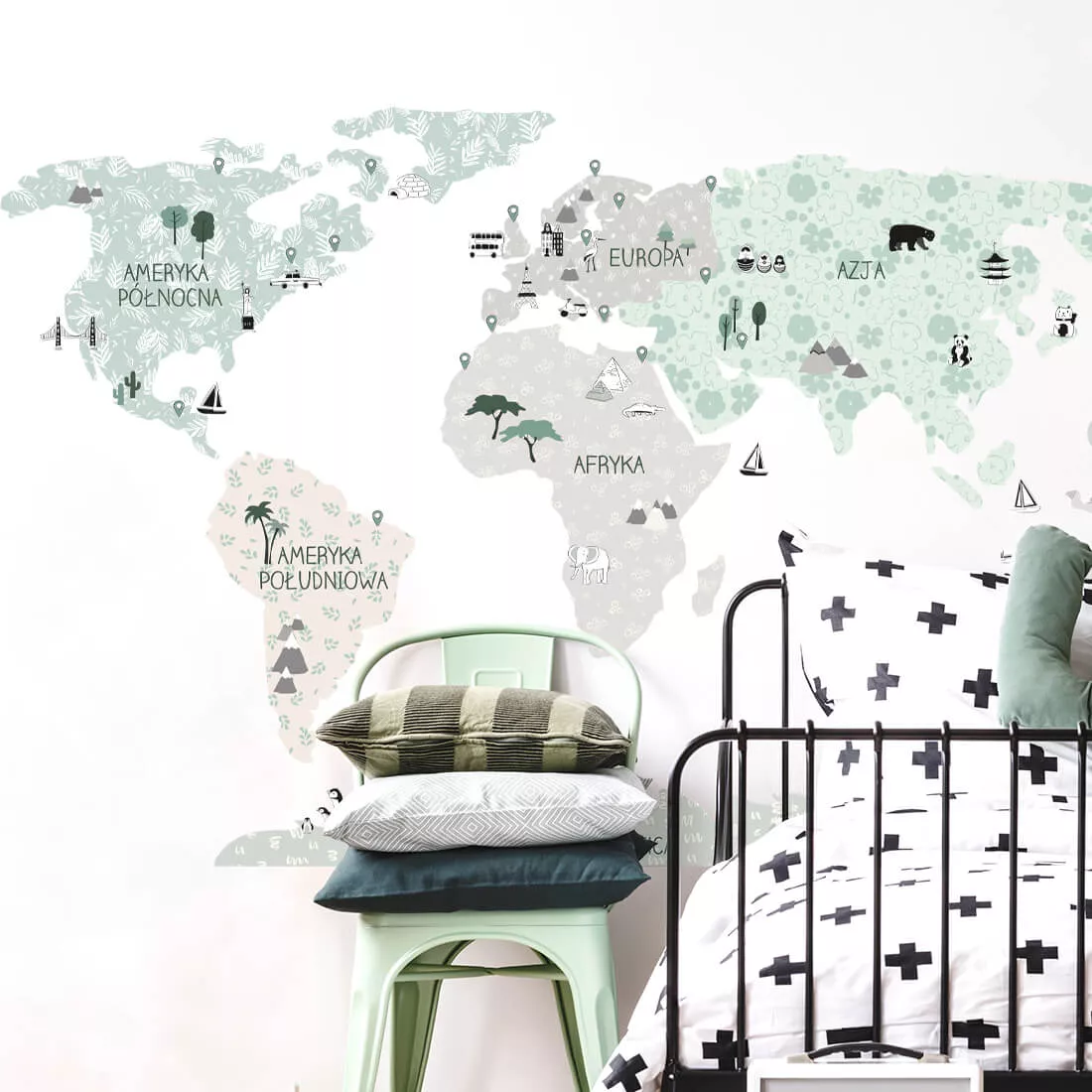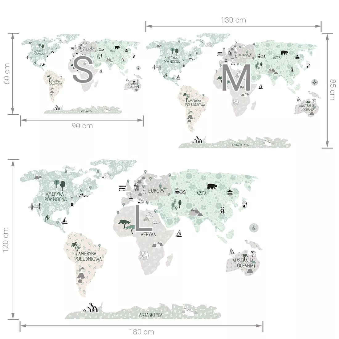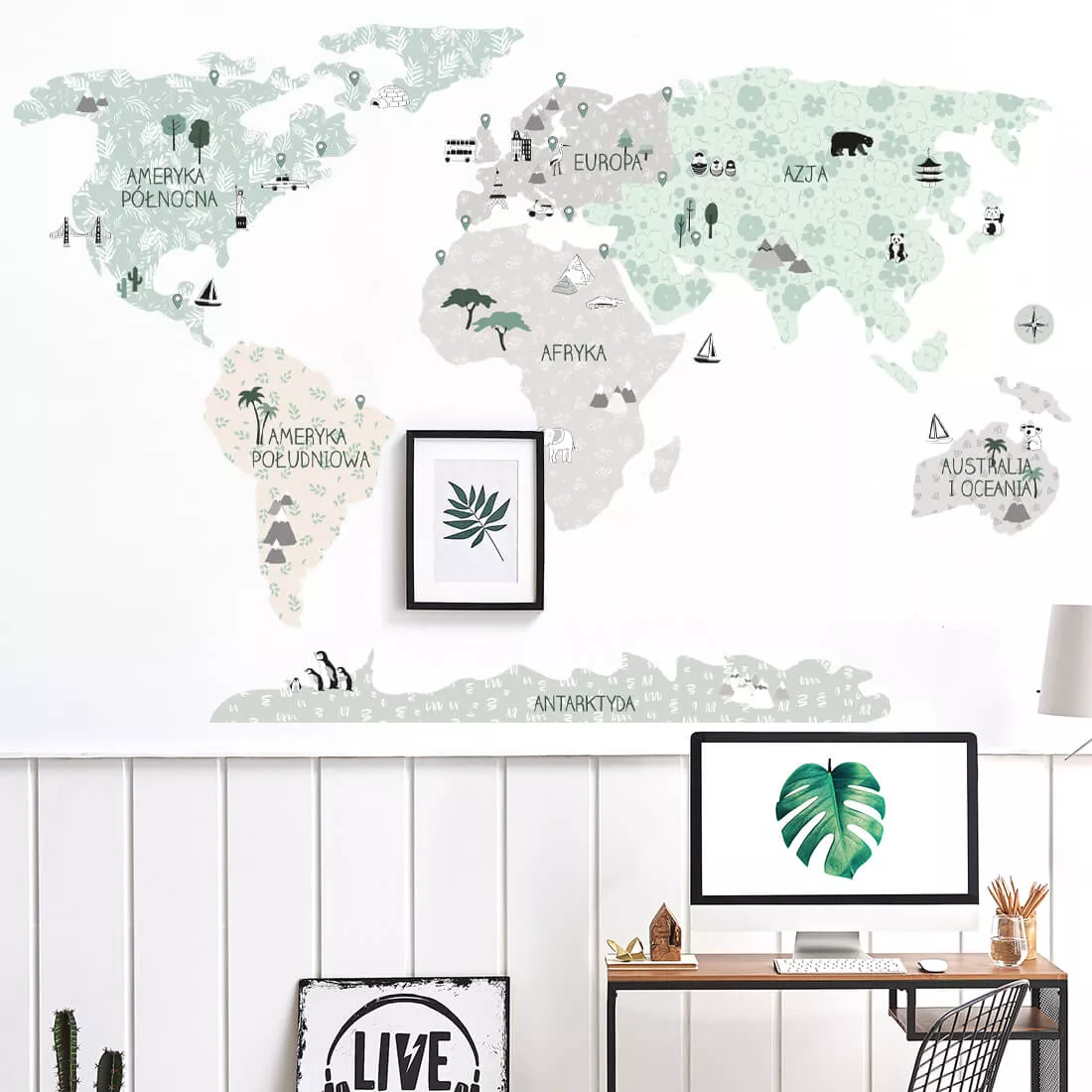 kontynenty, wyspy oraz elementy dodatkowe (edukacyjne).