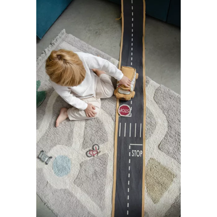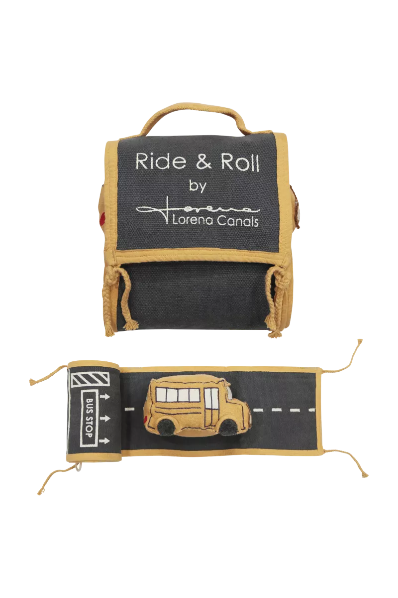 Czas na zabawę! Dzięki zestawowi Ride & Roll dzieci będą cieszyć się toczeniem długiej płóciennej ścieżki wokół domu i jazdą po niej miękkim autobusem-zabawką — 4-metrowe bawełniane płótno, które pozwoli im puścić wodze fantazji!