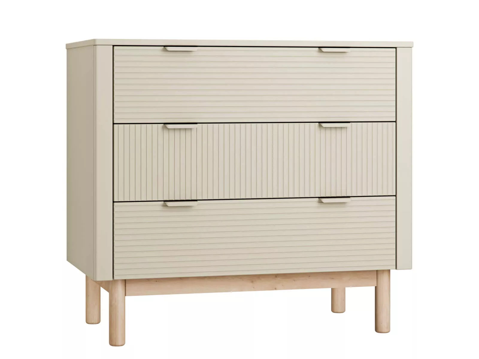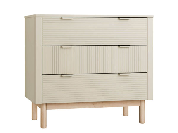 Design kolekcji kładzie nacisk na detal i elegancję – ryflowane fronty dodają charakteru i klasy, zaś delikatnie zaokrąglone narożniki gwarantują bezpieczeństwo młodych użytkowników. Estetyczne metalowe uchwyty oraz drewniane bukowe nóżki nadają meblowi lekkości i finezji.