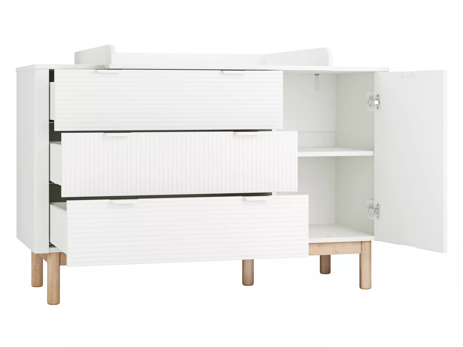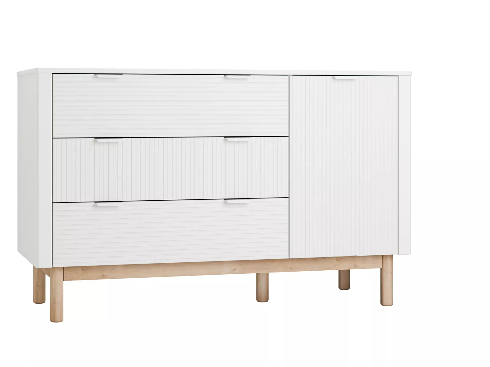 Design kolekcji kładzie nacisk na detal i elegancję – ryflowane fronty dodają charakteru i klasy, zaś delikatnie zaokrąglone narożniki gwarantują bezpieczeństwo młodych użytkowników. Estetyczne metalowe uchwyty oraz drewniane bukowe nóżki nadają meblowi lekkości i finezji.