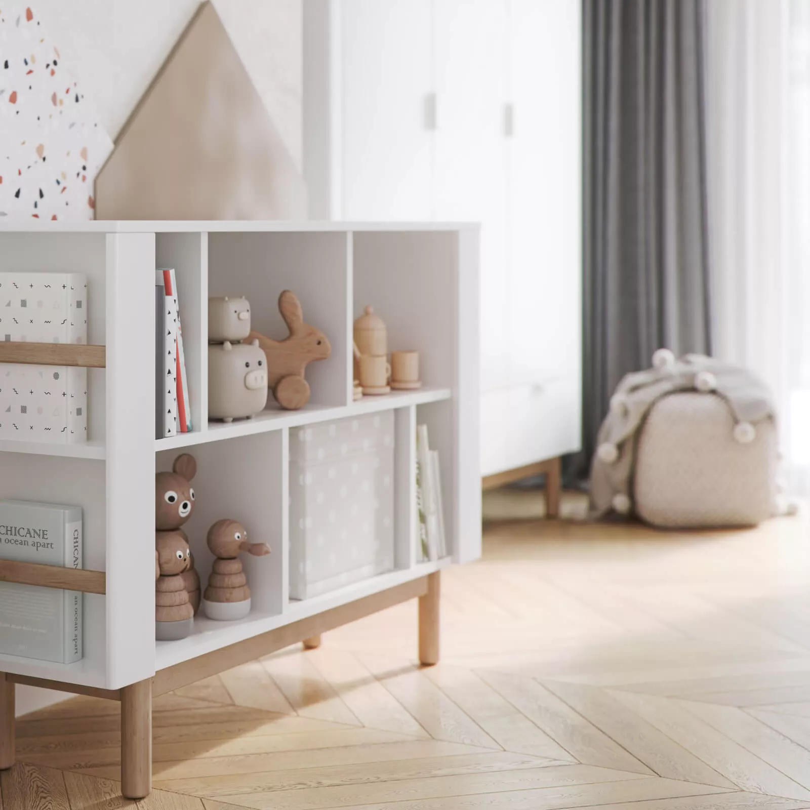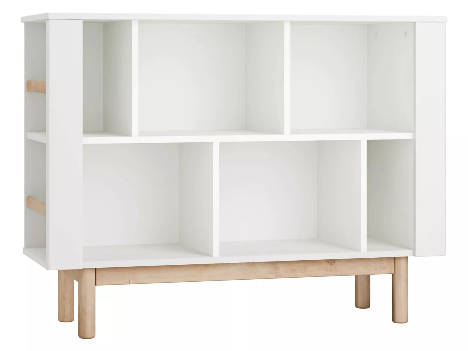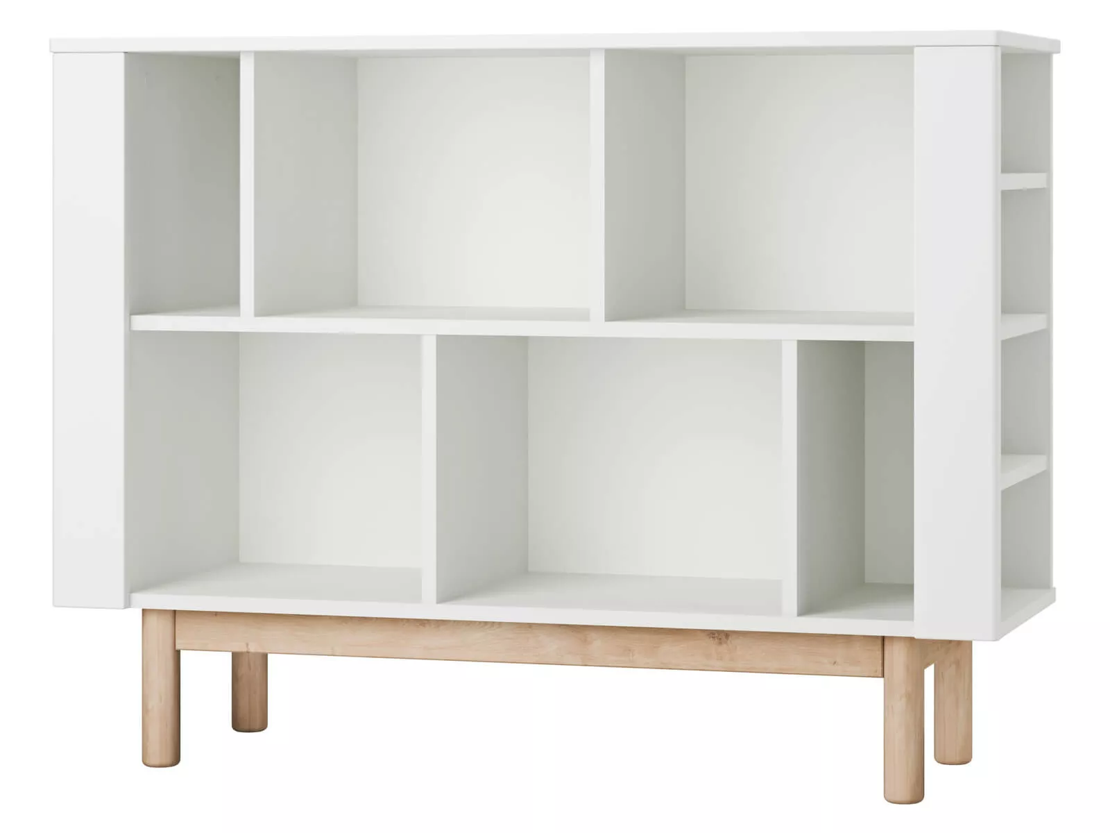 Ciekawy w swojej formie niski regał z kolekcji Miloo. Pomyślany z myślą o pokojach ze ścianami kolankowymi (skosami) pod którymi nie ma wiele możliwości aranżacji wnętrz, ale nie tylko. Wzdłuż lewego boku znajdują się dwie półki na książki, natomiast z prawej strony są 4 półki na drobiazgi – figurki, samochodziki itd
