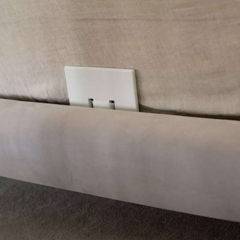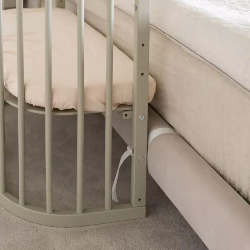 Dodatkowy pas zabezpieczający przed odsunięciem się dostawki od łóżka rodziców, wykonany został z paska parcianego.