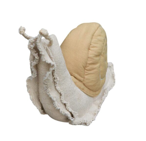 Ta poduszka stanowi elegancki element wystroju, który może wtopić się nawet w salon lub inne miejsce w domu, ku radości najmłodszych. Wykonana jest ręcznie z płótna bawełnianego w kolorach miodowym i beżowym, w połączeniu z naturalnym płótnem, które uwidacznia wzór muszli. Wypełniona jest perełkami z polistyrenu i posiada ręcznie plecione ogonki. Wypełniacz zdejmowany za pomocą zamka błyskawicznego do prania.