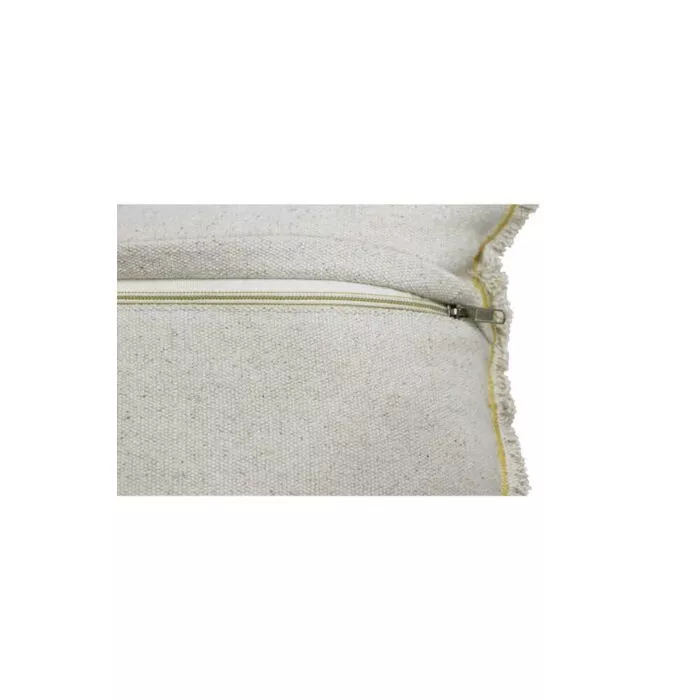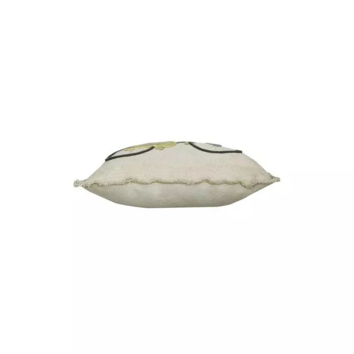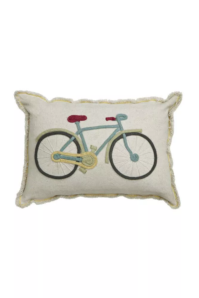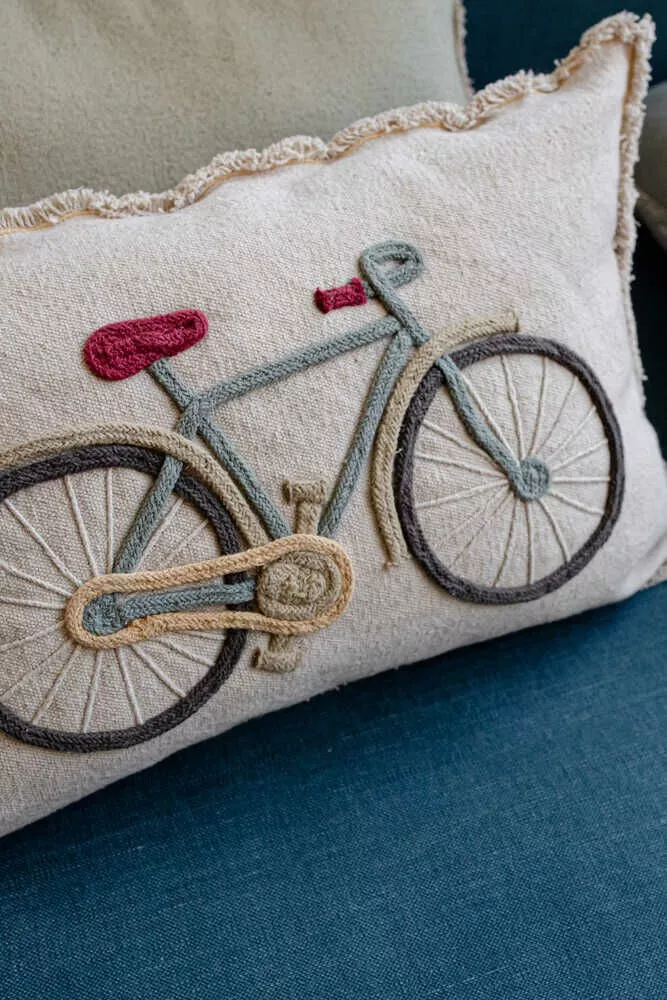 Prostokątna poduszka wykonana z naturalnego płótna bawełnianego, z ręcznie szytym rowerem z przodu. Rower jest haftowany przy użyciu bawełnianych sznurków w kolorach Olive, ciemnoszarym, ciemnoczerwonym, Honey i Vintage Blue. Brzegi wykończone kontrastowym haftem w kolorze Honey oraz krótkimi frędzlami dookoła. Poduszka posiada klapę z tyłu z ukrytym zamkiem błyskawicznym. Wyjmowany wewnętrzny wypełniacz.