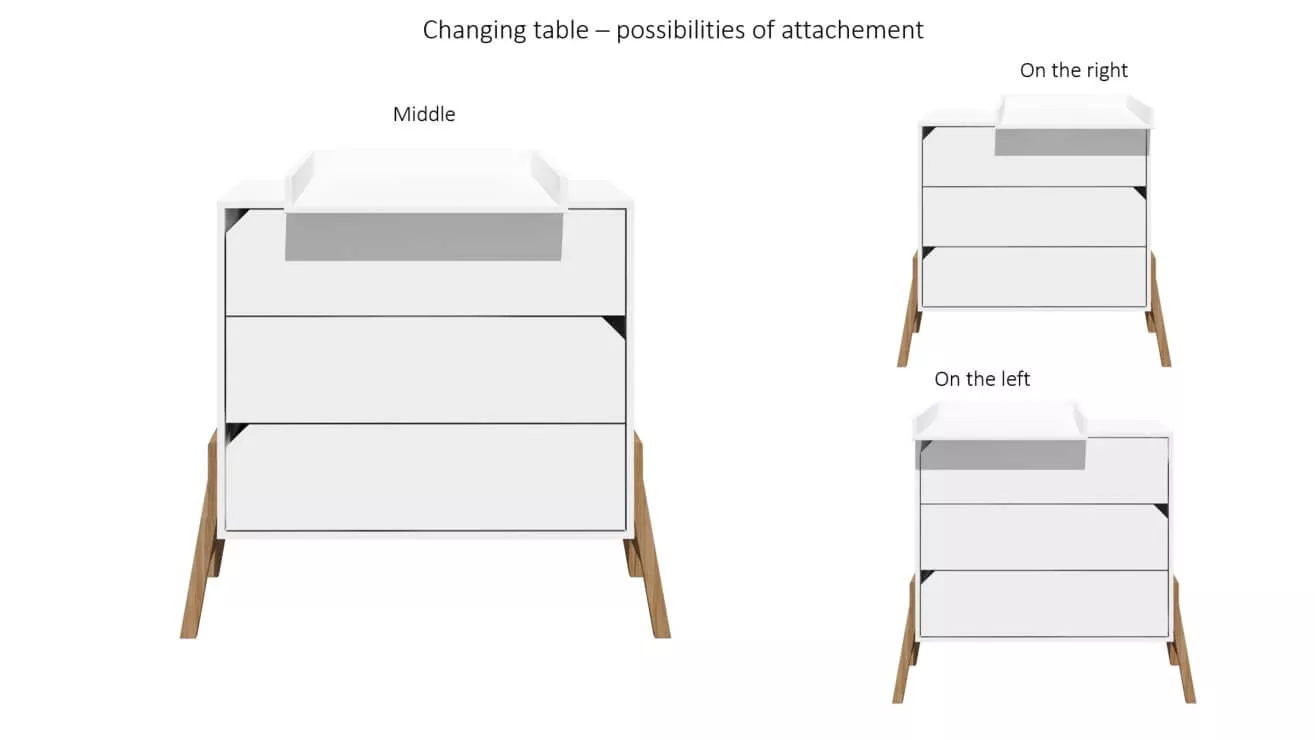 Przewijak pasuje do komód z tej samej linii, ale dzięki prostemu systemowi montażu, możesz go z łatwością zamontować po lewej, prawej stronie lub na środku blatu. To wyjątkowa elastyczność, która pozwala na dostosowanie mebla do indywidualnych potrzeb Twojego wnętrza.