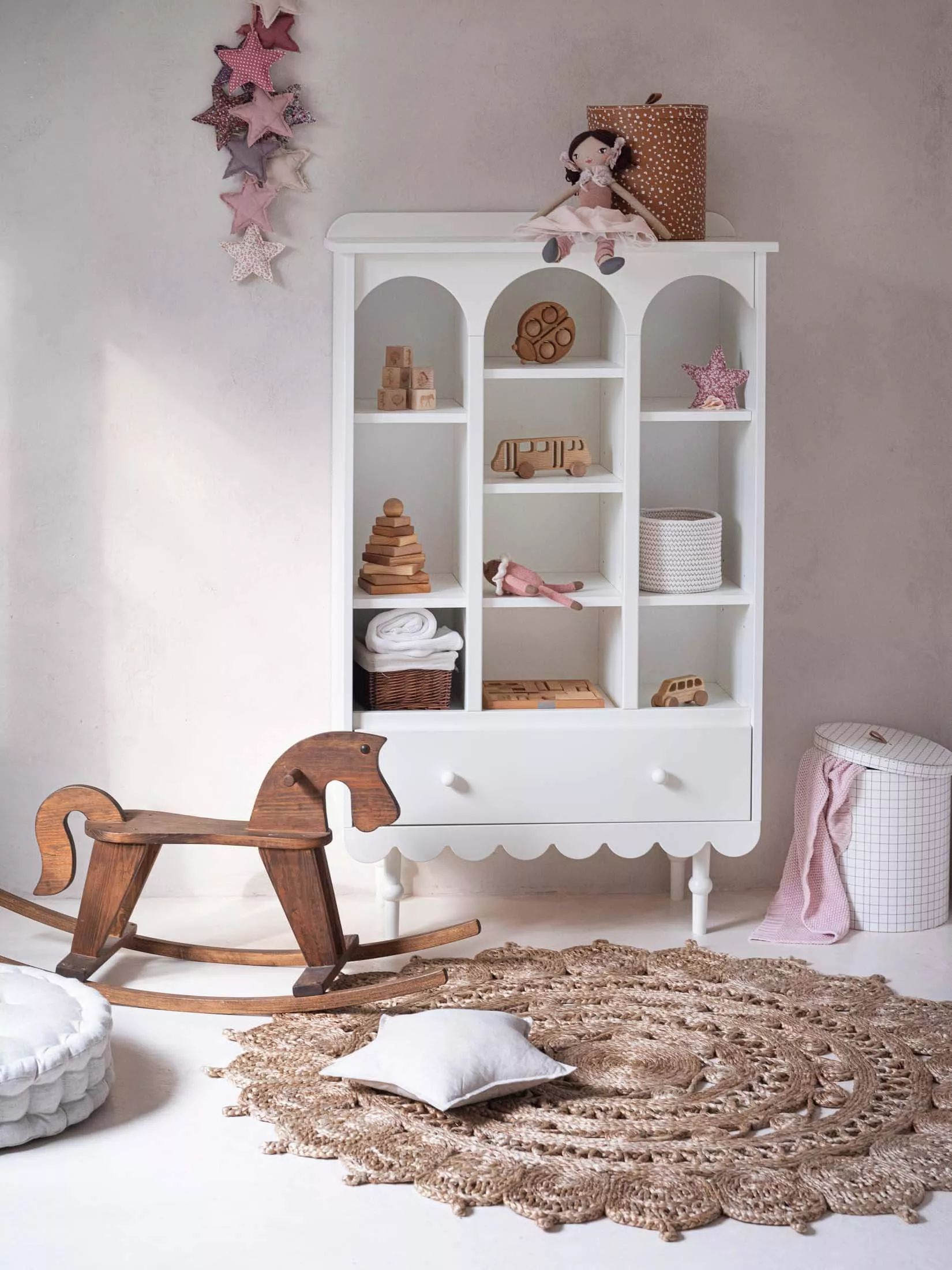 Regał w kolorze klasycznej bieli z kolekcji Babushka. Ten uroczy i funkcjonalny mebel doskonale sprawdzi się w każdym dziecięcym pokoju, łącząc w sobie estetykę i praktyczność.