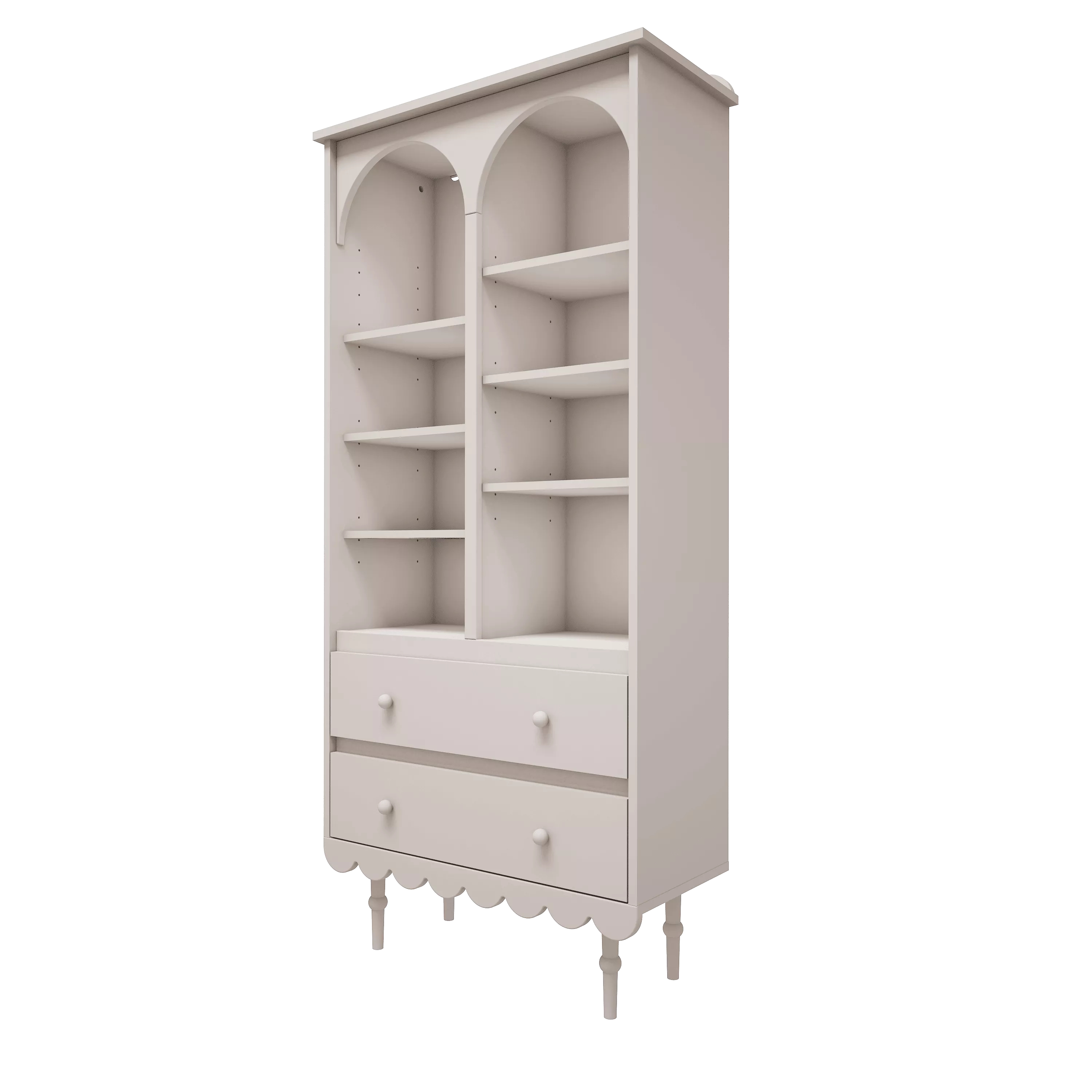 Regał Babushka wyróżnia się delikatnym, ponadczasowym wzornictwem. Klasyczna biel w połączeniu z subtelną falbanką u dołu nadaje meblowi lekkości i wyjątkowego uroku, który doskonale komponuje się z meblami z tej samej kolekcji – jak szafa czy komoda Babushka.