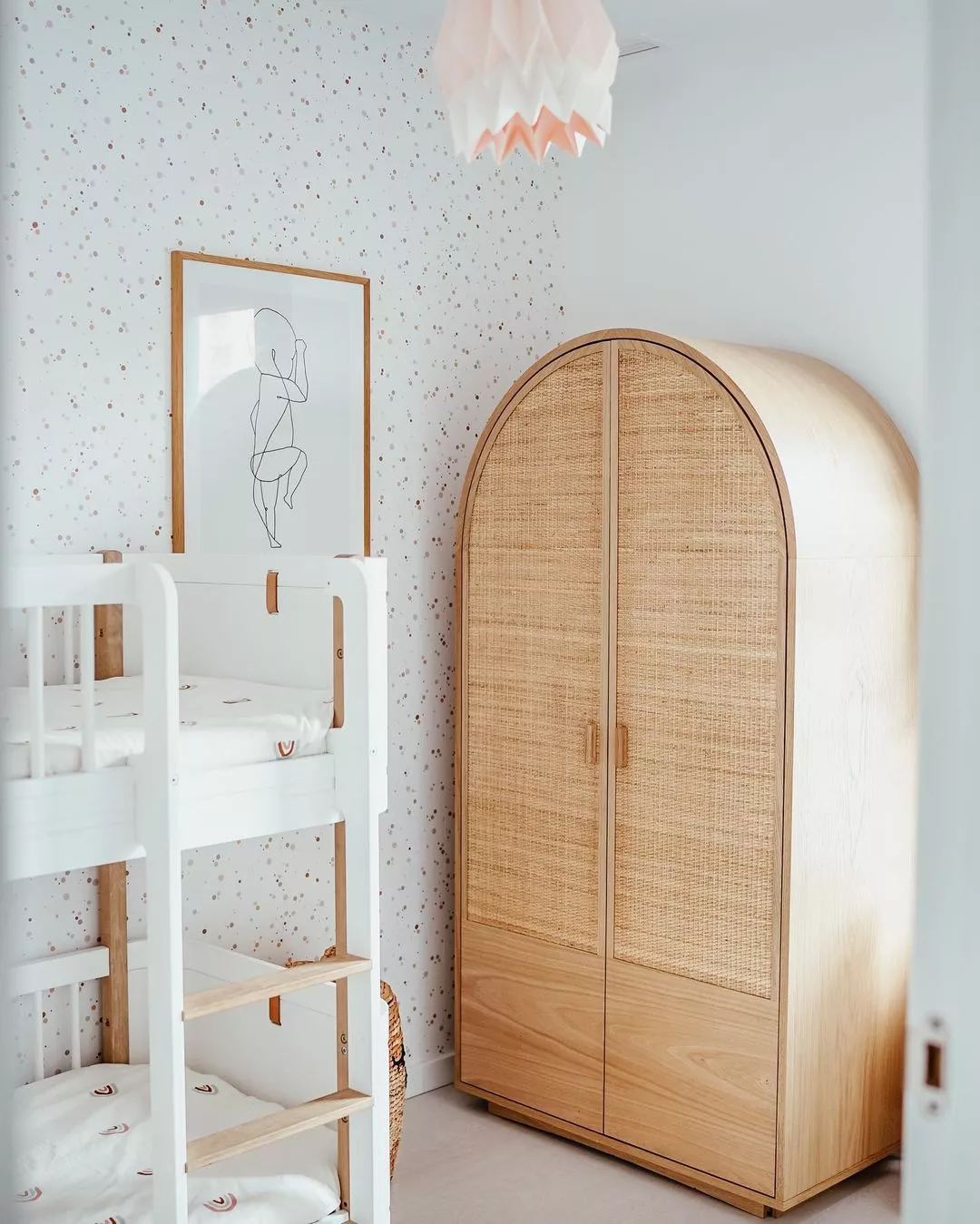 Bardzo drobny wzór, bo największe kropki maja wielkość zaledwie 1,5 cm. Dlatego ta tapeta nie zaburzy dotychczasowego (lub planowanego) wystroju pokoju. Ma za zadanie podkreślić kolorystykę wnętrza. Dlatego zaplanowaliśmy ją w dwóch wersjach: baza jest zawsze beżowo-brązowa, jednak na jednej tapecie widnieją elementy granatowe, a na drugiej w stonowanym różu. Do tego neutralne białe tło.