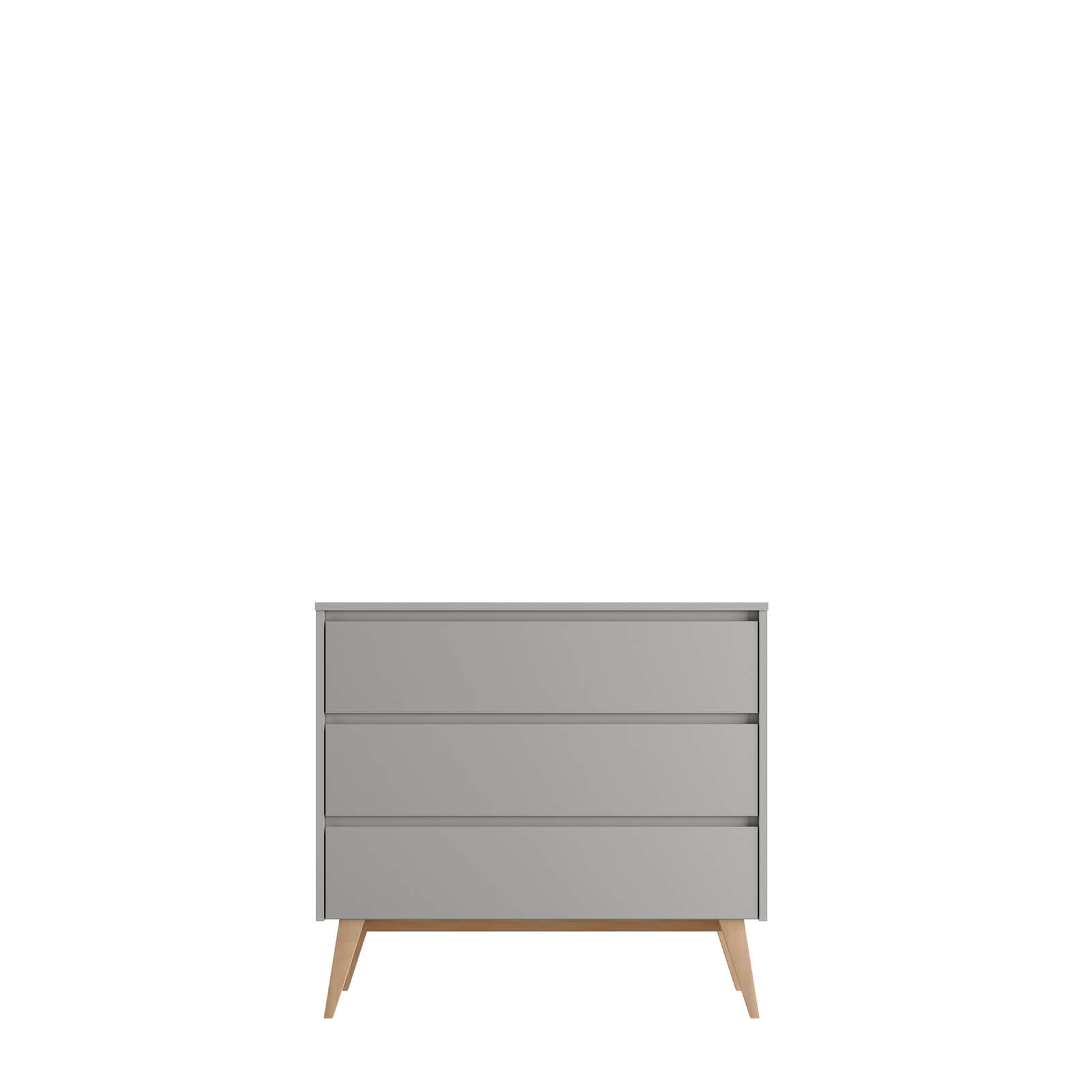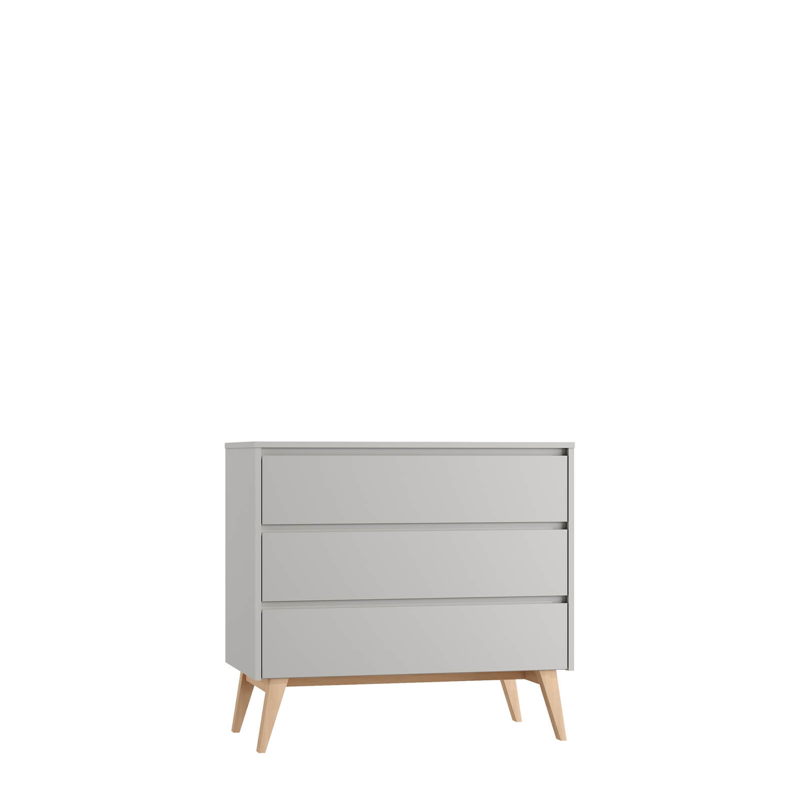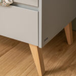 Komoda wykonana jest z malowanej płyty MDF, płyty laminowanej (korpus, elementy wewnętrzne) oraz z litego drewna bukowego (nóżki).
