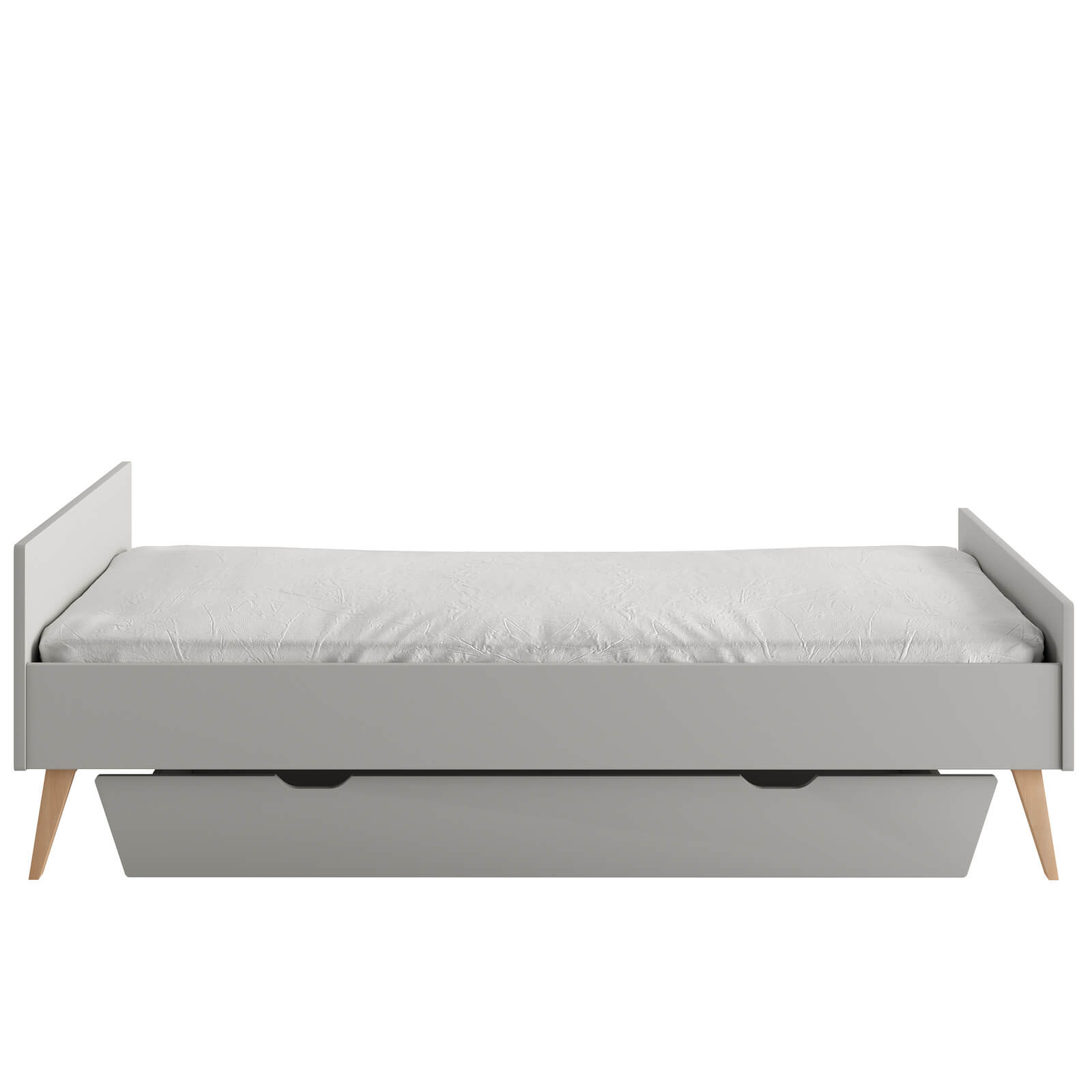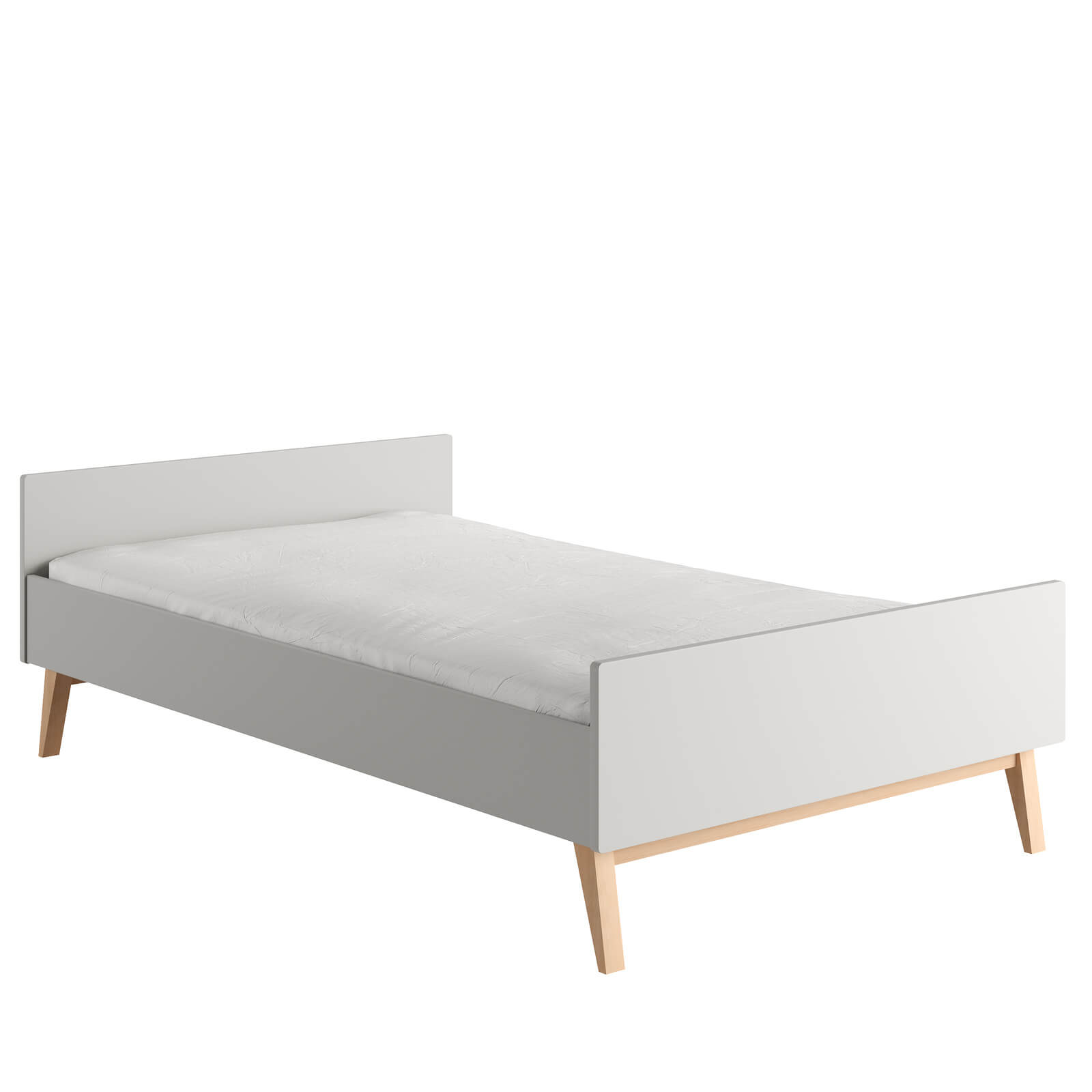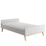 Łóżko wykonane z litego drewna bukowego lakierowanego (nóżki) i lakierowanej płyty MDF, stelaż wykonany z drewna sosnowego.