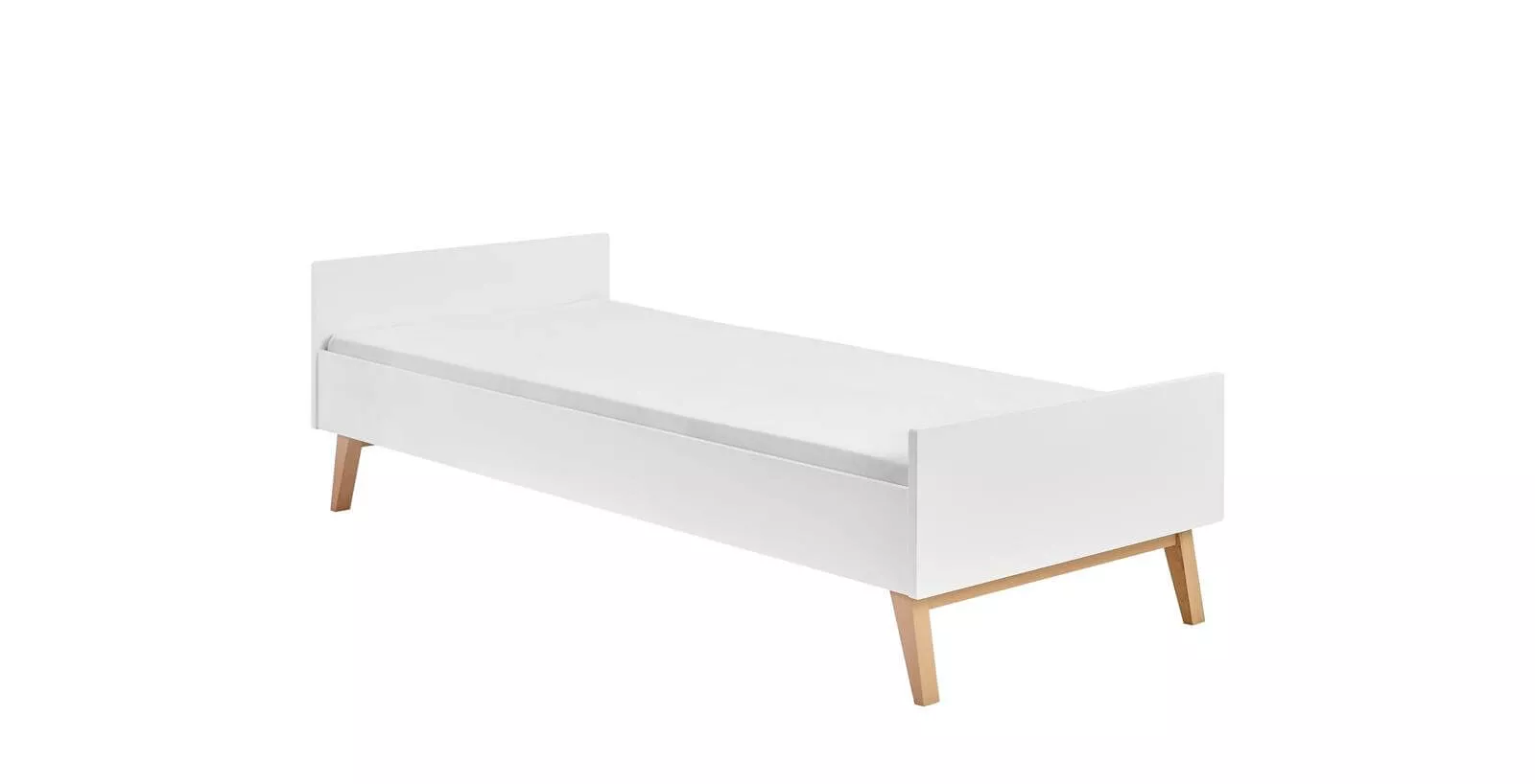 Łóżko wykonane z litego drewna bukowego lakierowanego (nóżki) i lakierowanej płyty MDF, stelaż wykonany z drewna sosnowego.
