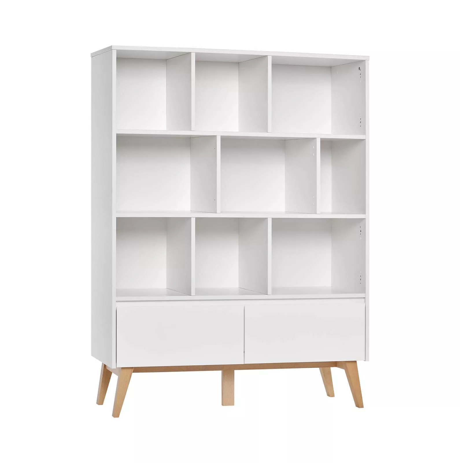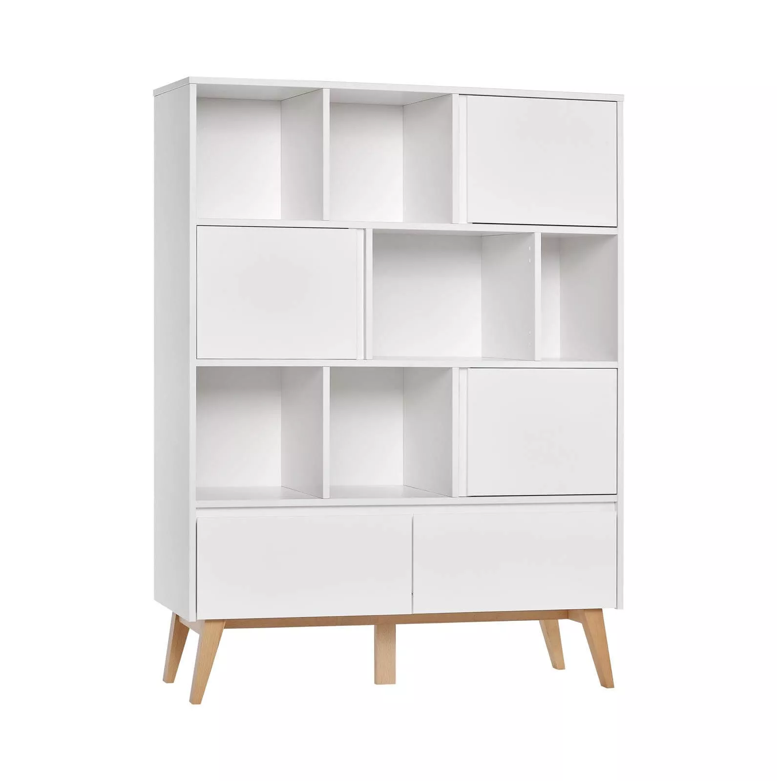 Regał szeroki z kolekcji Swing posiada asymetryczny układ półek o różnej szerokości oraz dwie szuflady wyposażone w wysokiej jakości prowadnice z hamulcem i samodotykiem.