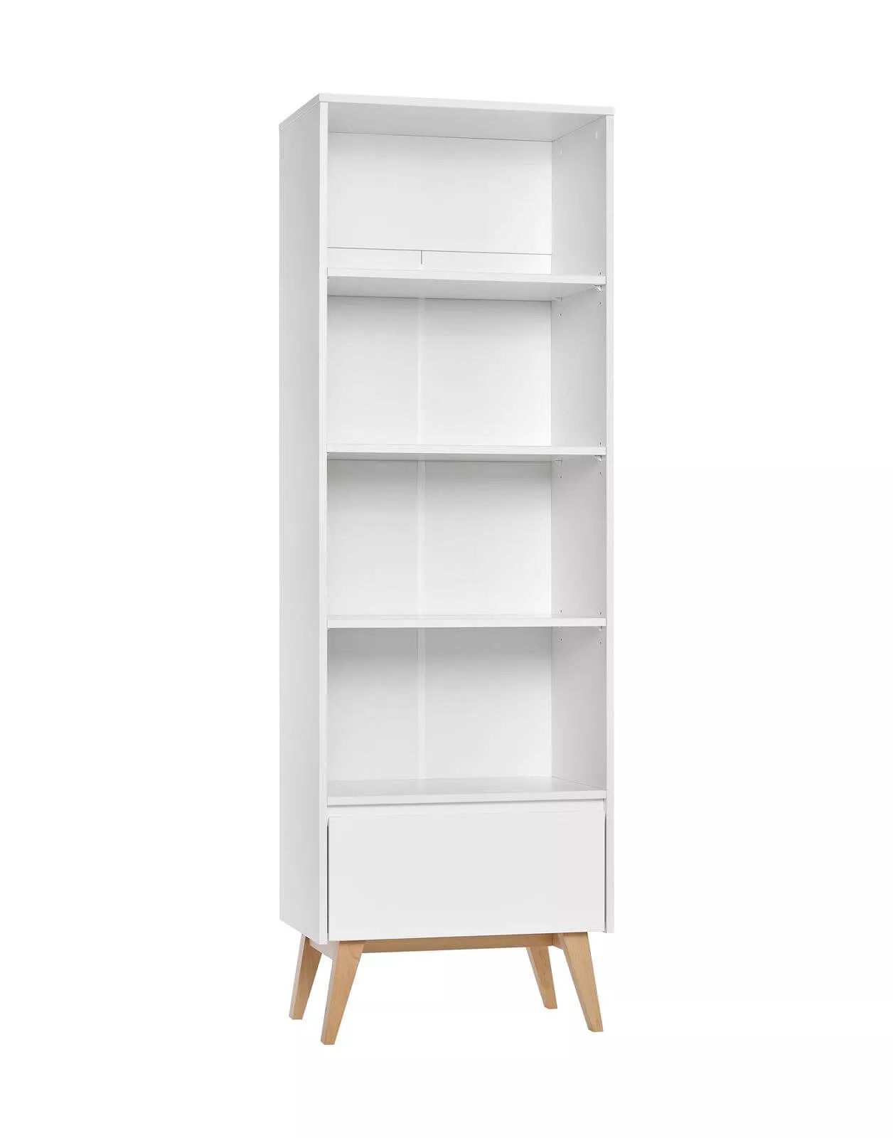 Regał wysoki z kolekcji Swing posiada 4 półki oraz jedną szufladę – jest ona wyposażona w wysokiej jakości prowadnicę z hamulcem i samodotykiem.