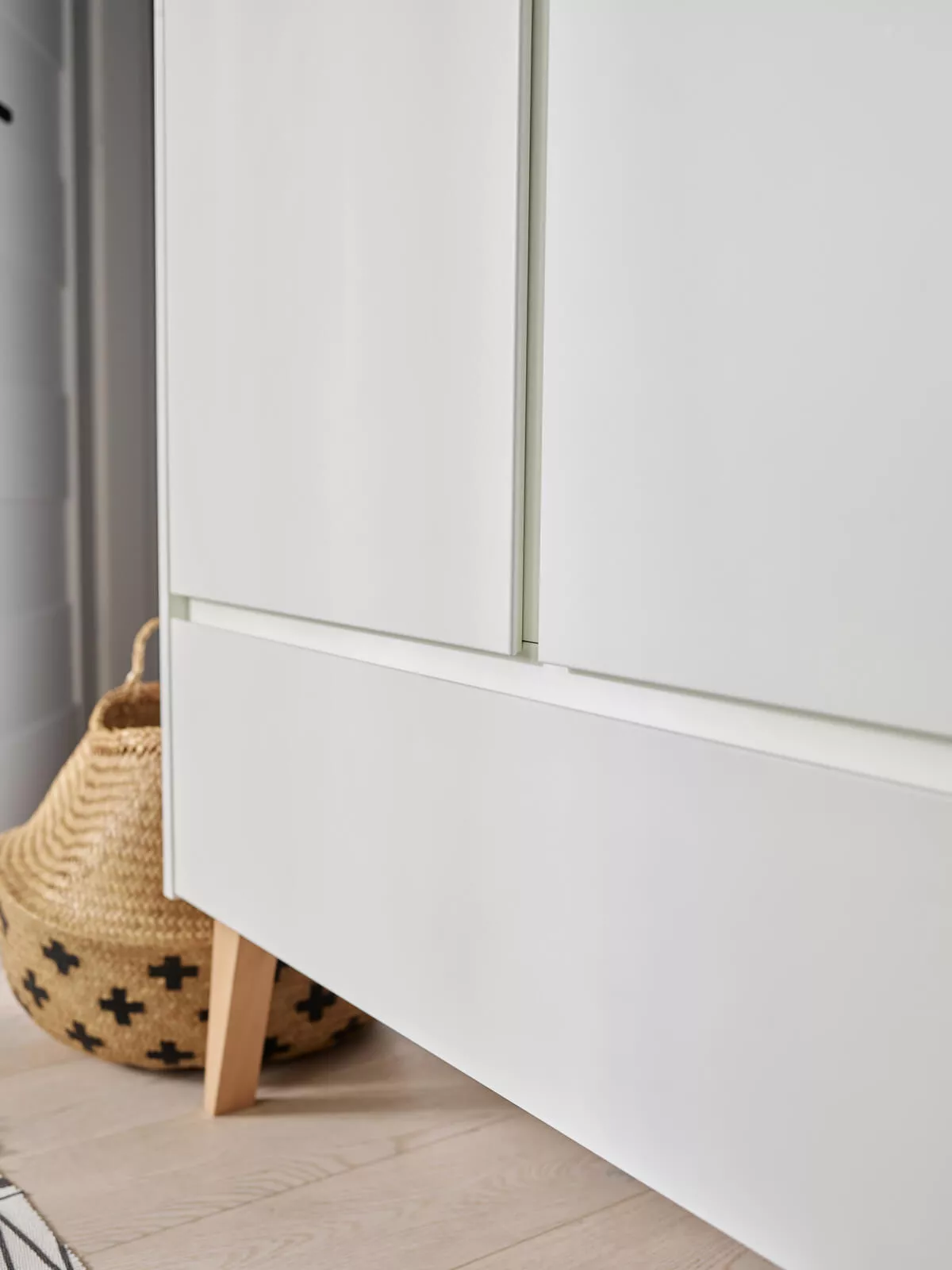 Szafa wykonana jest z malowanej płyty MDF ( fronty),litego drewna bukowego lakierowanego (nóżki) oraz płyty laminowanej oklejanej bezspoinowo.