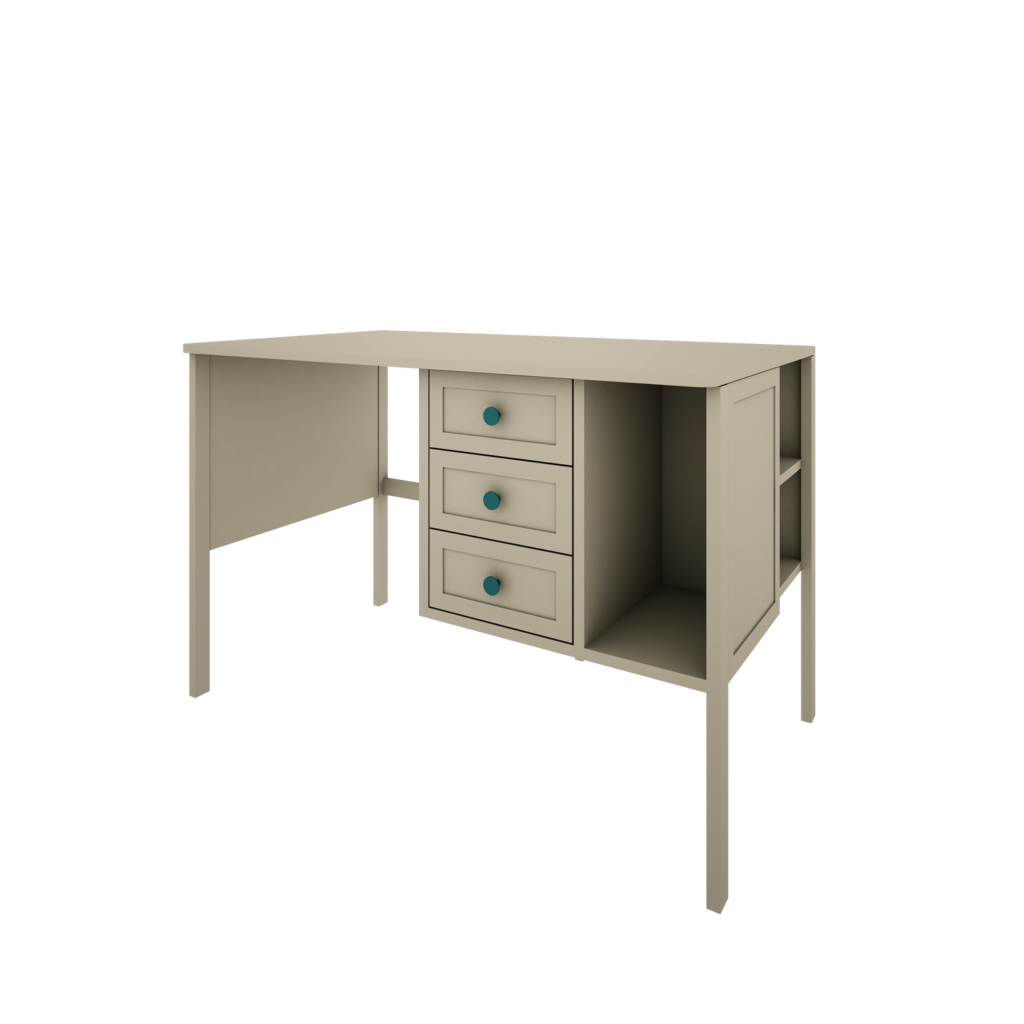 malowana płyta MDF (fronty + blat górny), płyty meblowej (korpus, półki, regał) oraz drewno bukowe (nogi) – wyprodukowane zgodnie z normą EN71/3 – norma dotycząca mebli dziecięcych oraz zabawek