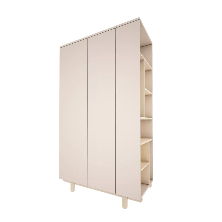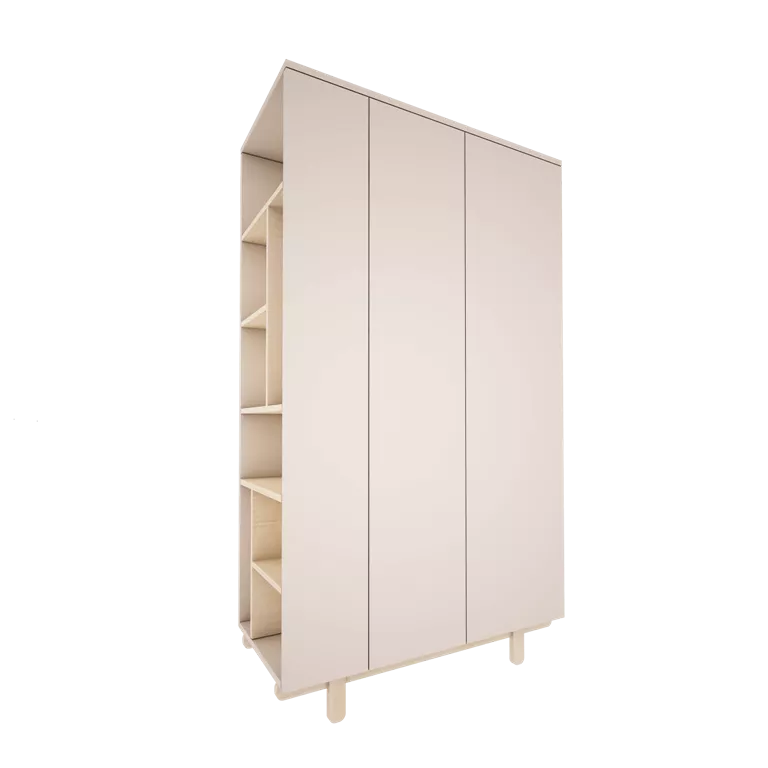 Drzwi szafy wyposażone są w wysokiej jakości zawiasy z systemem push-to-open, dzięki którym za pomocą kliknięcia można je otworzyć. W boku komody znajduje się regał będący nie tylko dodatkowym miejscem do przechowywania ale też elementem dekoracyjnym. Regał może być montowany zarówno po prawej lub po lewej stronie szafy.